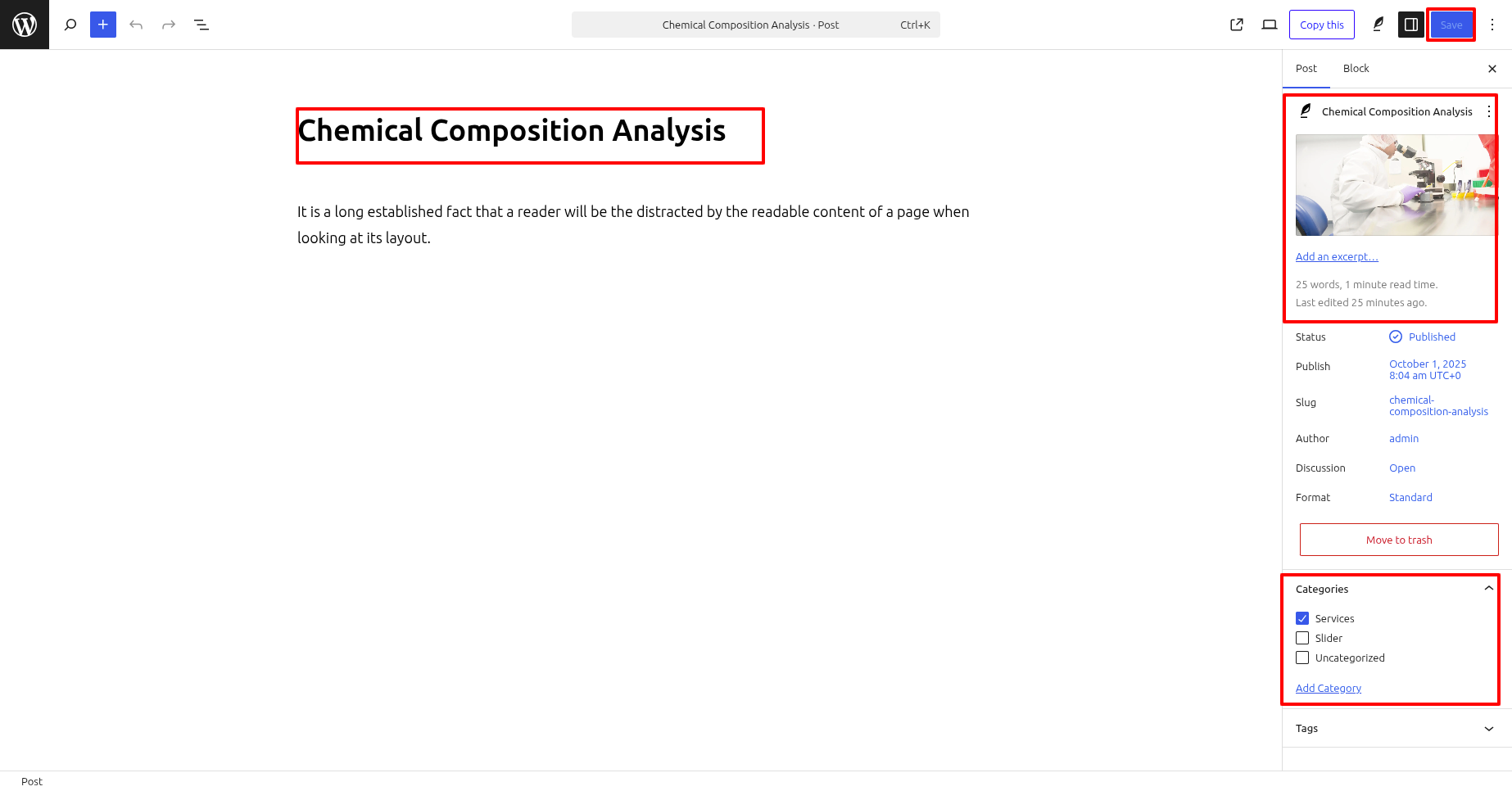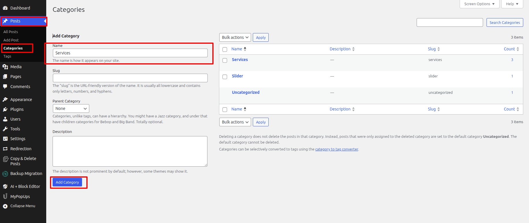 Select Services Section Settings from Dashboard >> Posts >> Categories .