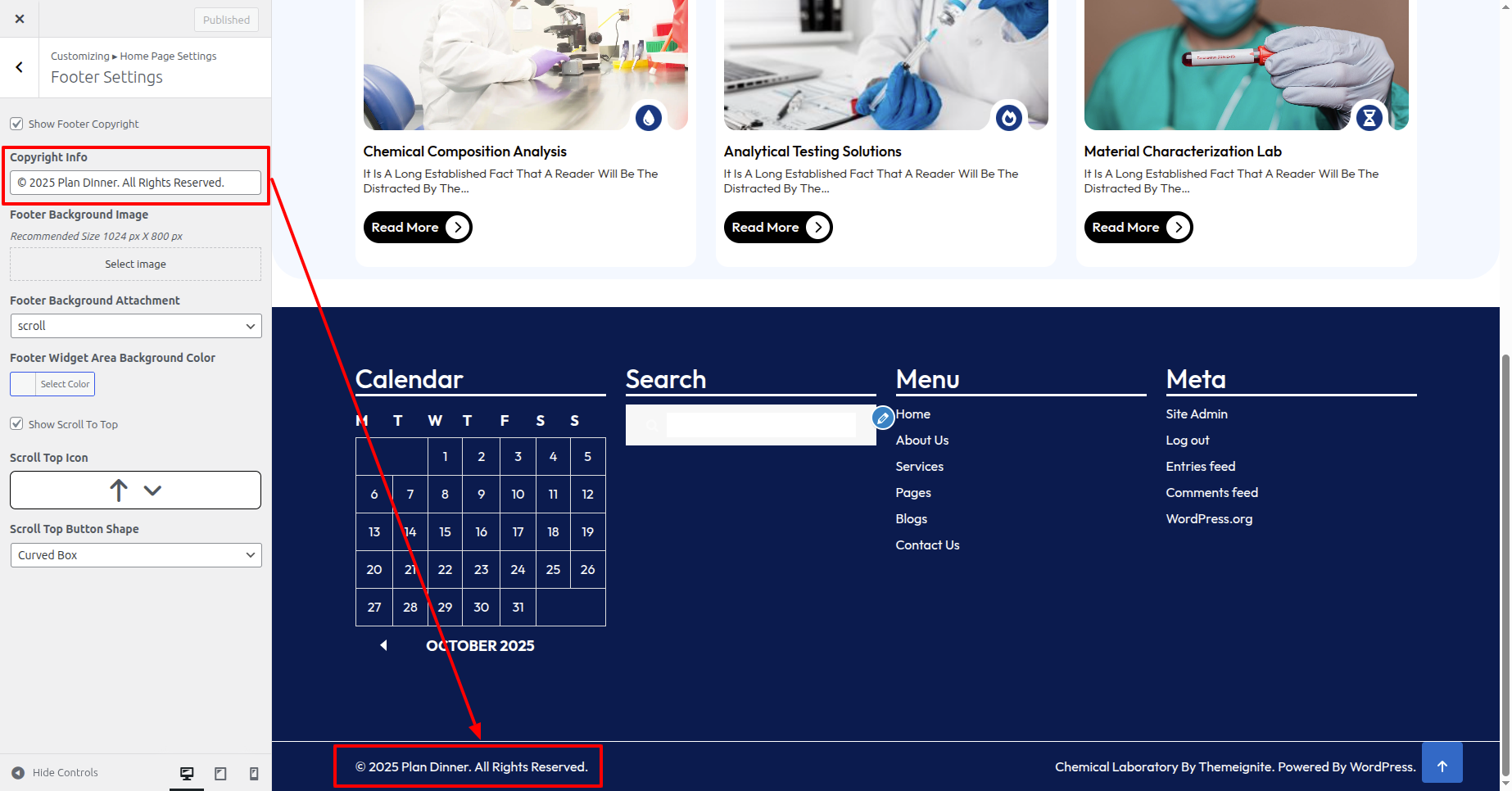 SELECT Customize >> Home Page Settings >> Footer Setting under Appearance.