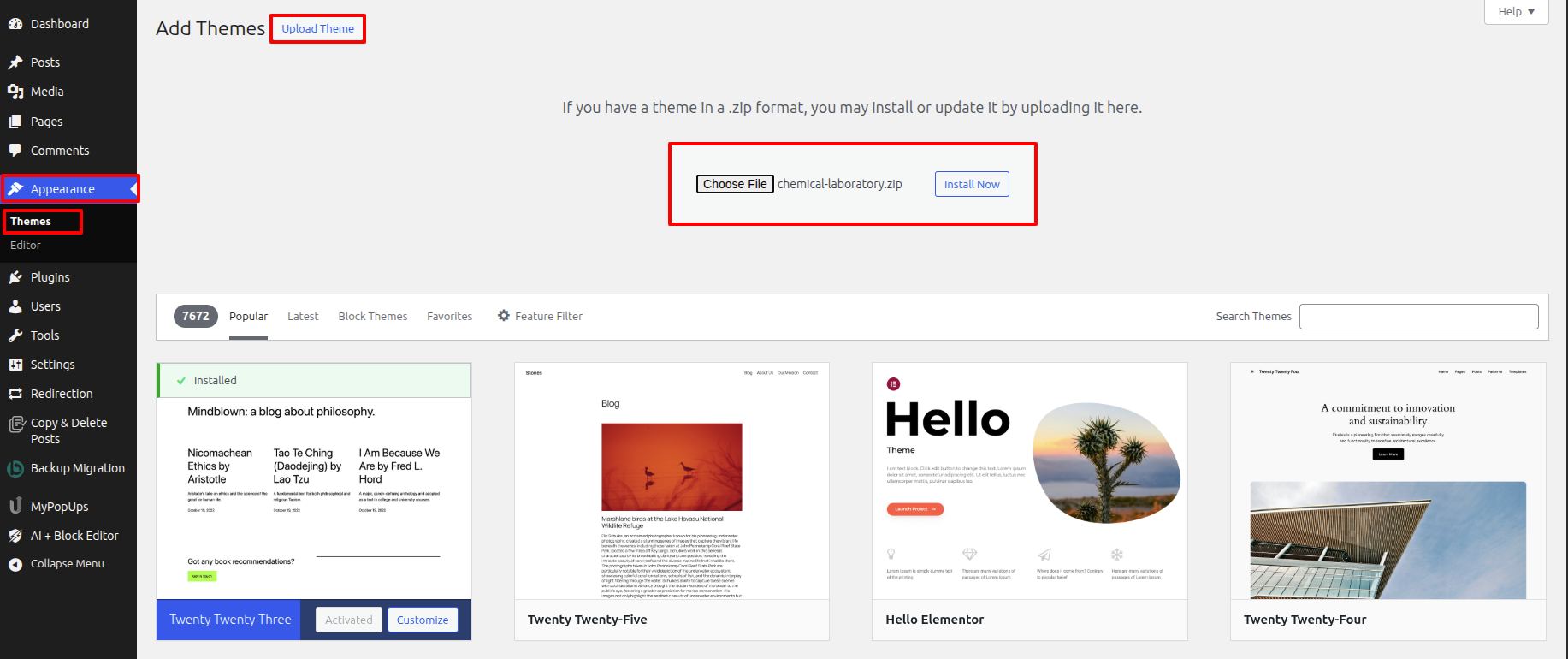 Select your chemical-laboratory.zip theme by clicking the Browse button, and then hit the Install Now button.
