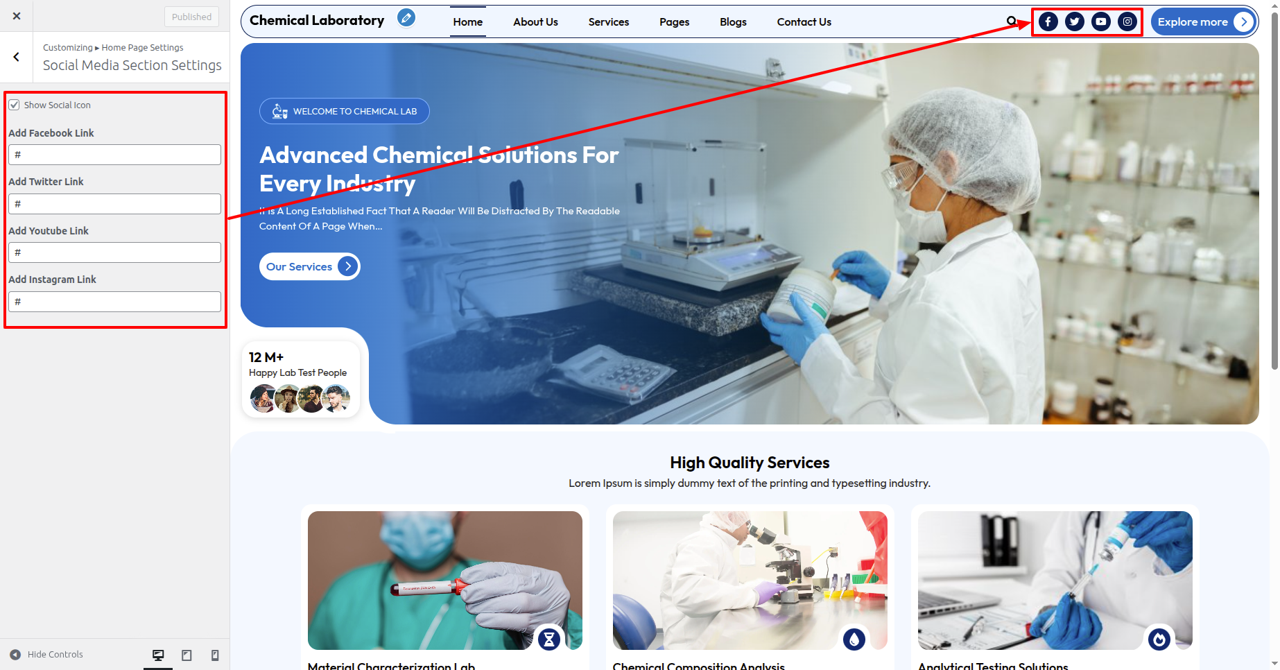 Select Social Media Section from Appearance >> Customize >> Home Page Settings >> Social Media Section Settings .