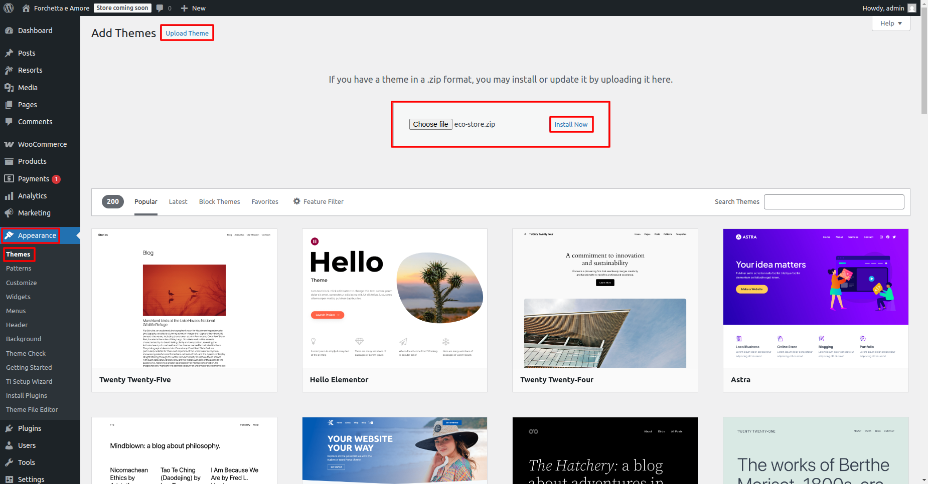 Select your eco-store.zip theme by clicking the Browse button, and then hit the Install Now button.
