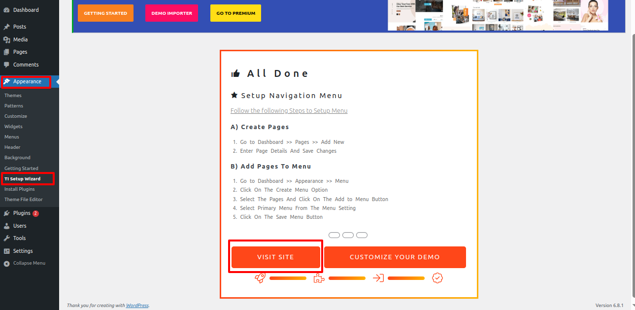 Select TI Setup Wizard from Dashboard >> Appearance >> TI Setup Wizard >> Start Now .