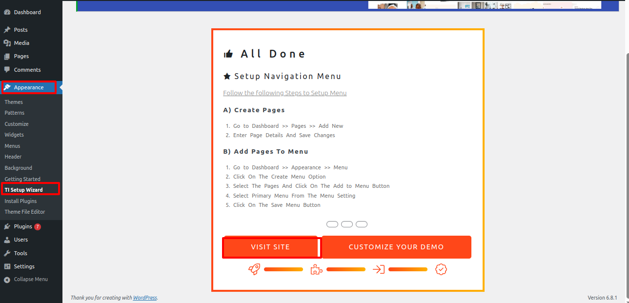 Select TI Setup Wizard from Dashboard >> Appearance >> TI Setup Wizard >> Start Now .