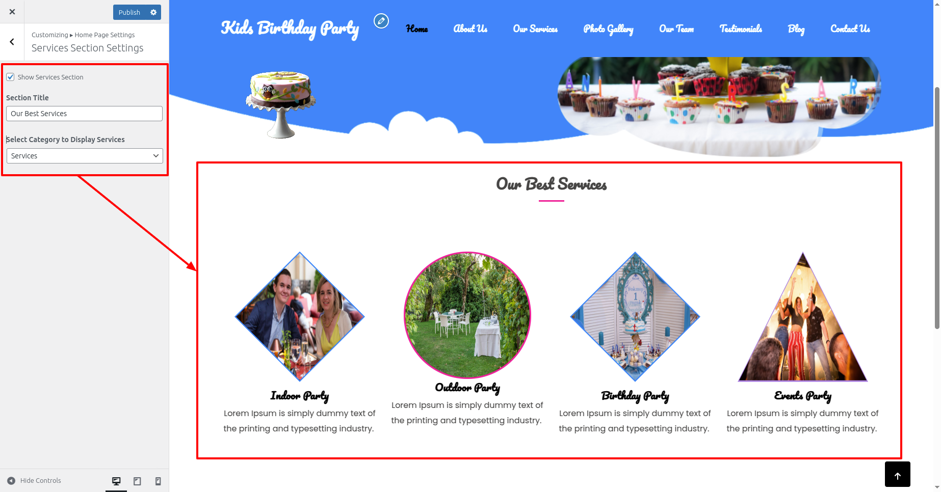 Select Services Section Settings from Appearance >> Customize >> Home Page Settings >> Services Section Settings .