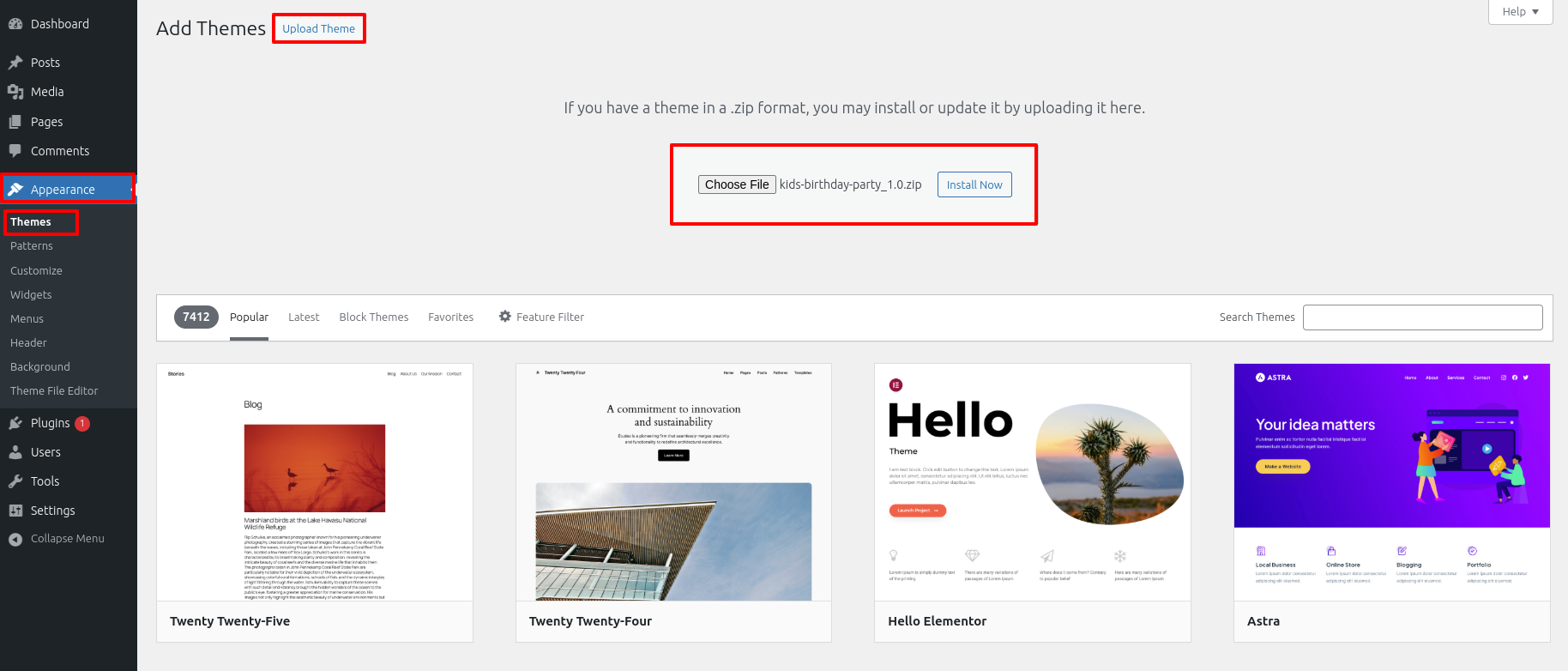 Select your kids-birthday-party.zip theme by clicking the Browse button, and then hit the Install Now button.