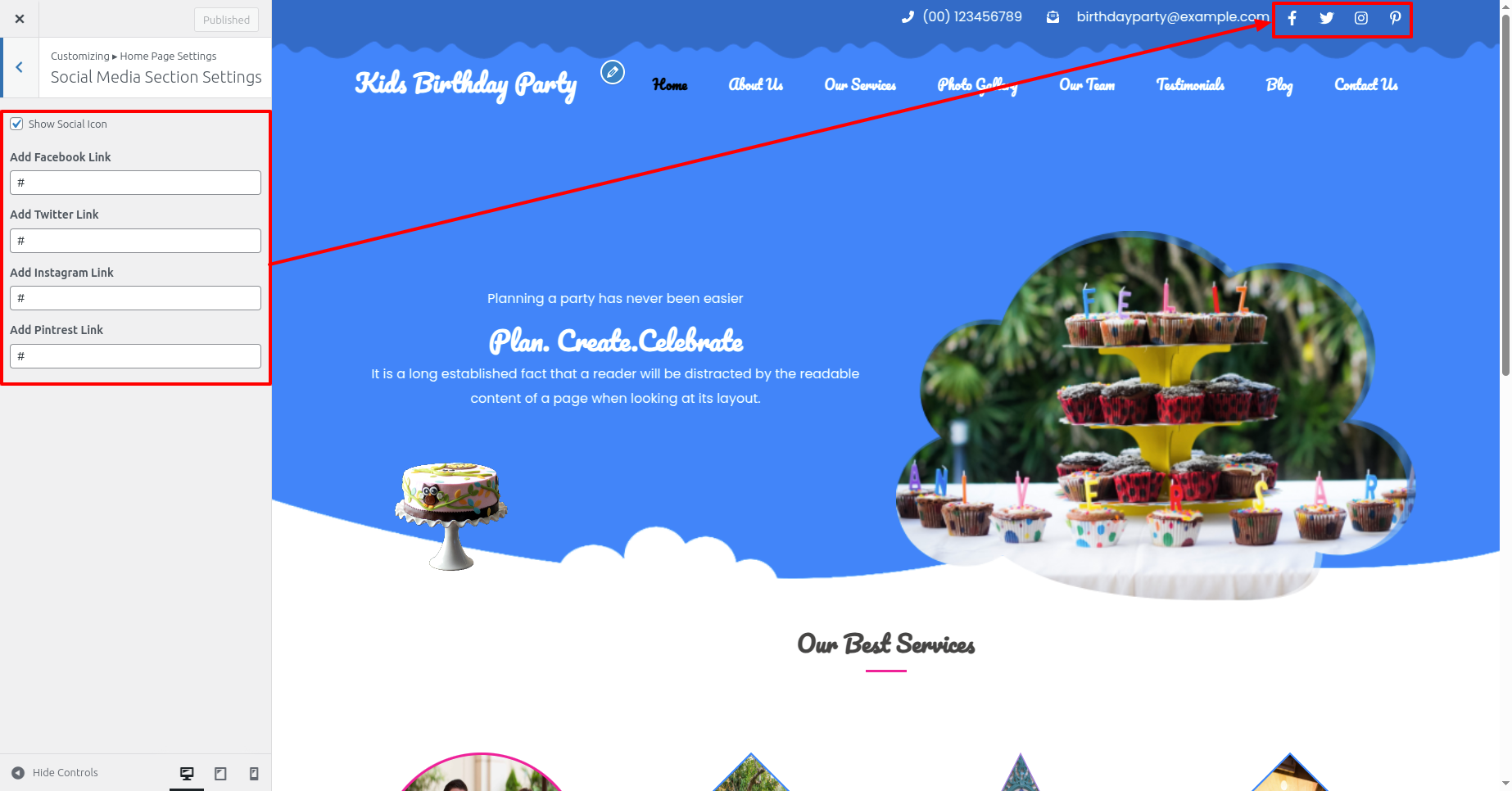 Select Social Media Section from Appearance >> Customize >> Home Page Settings >> Social Media Section Settings .