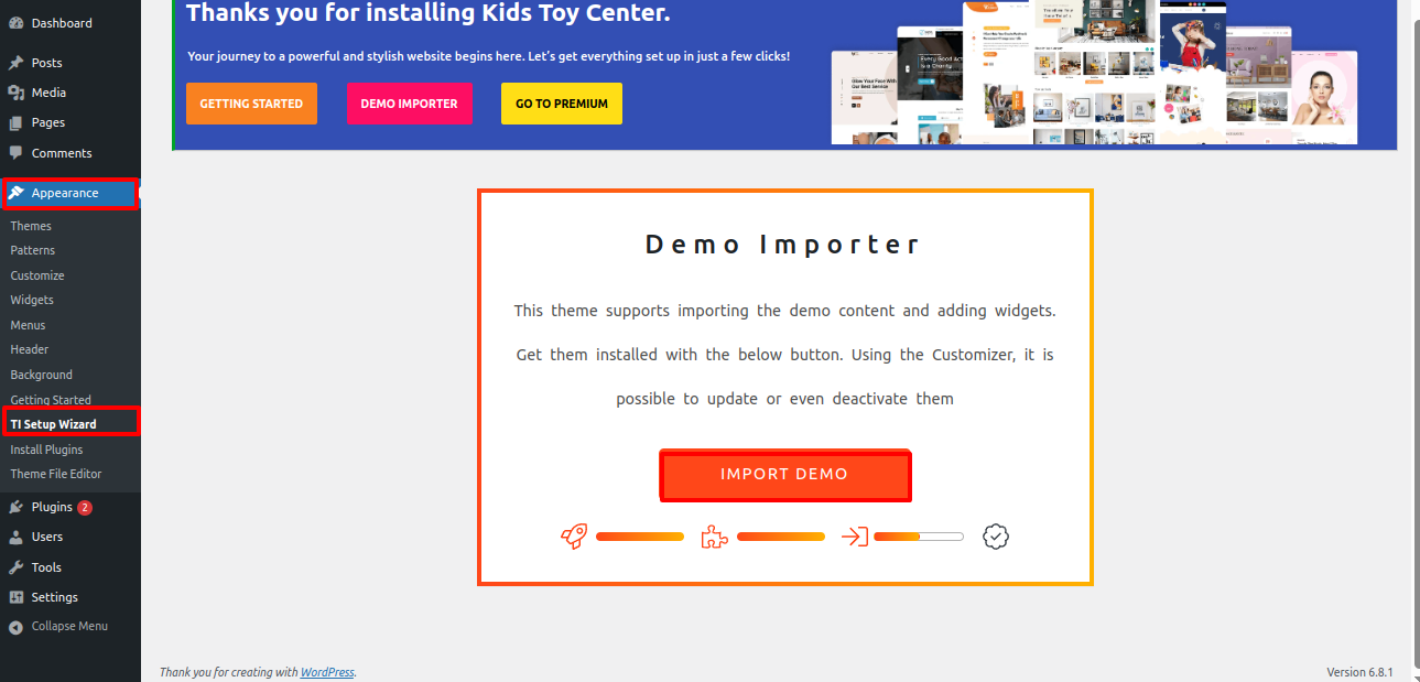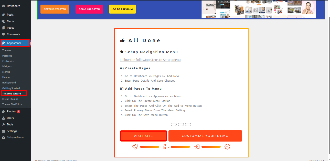 Select TI Setup Wizard from Dashboard >> Appearance >> TI Setup Wizard >> Start Now .
