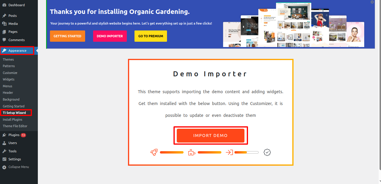 Select TI Setup Wizard from Dashboard >> Appearance >> TI Setup Wizard >> Start Now .