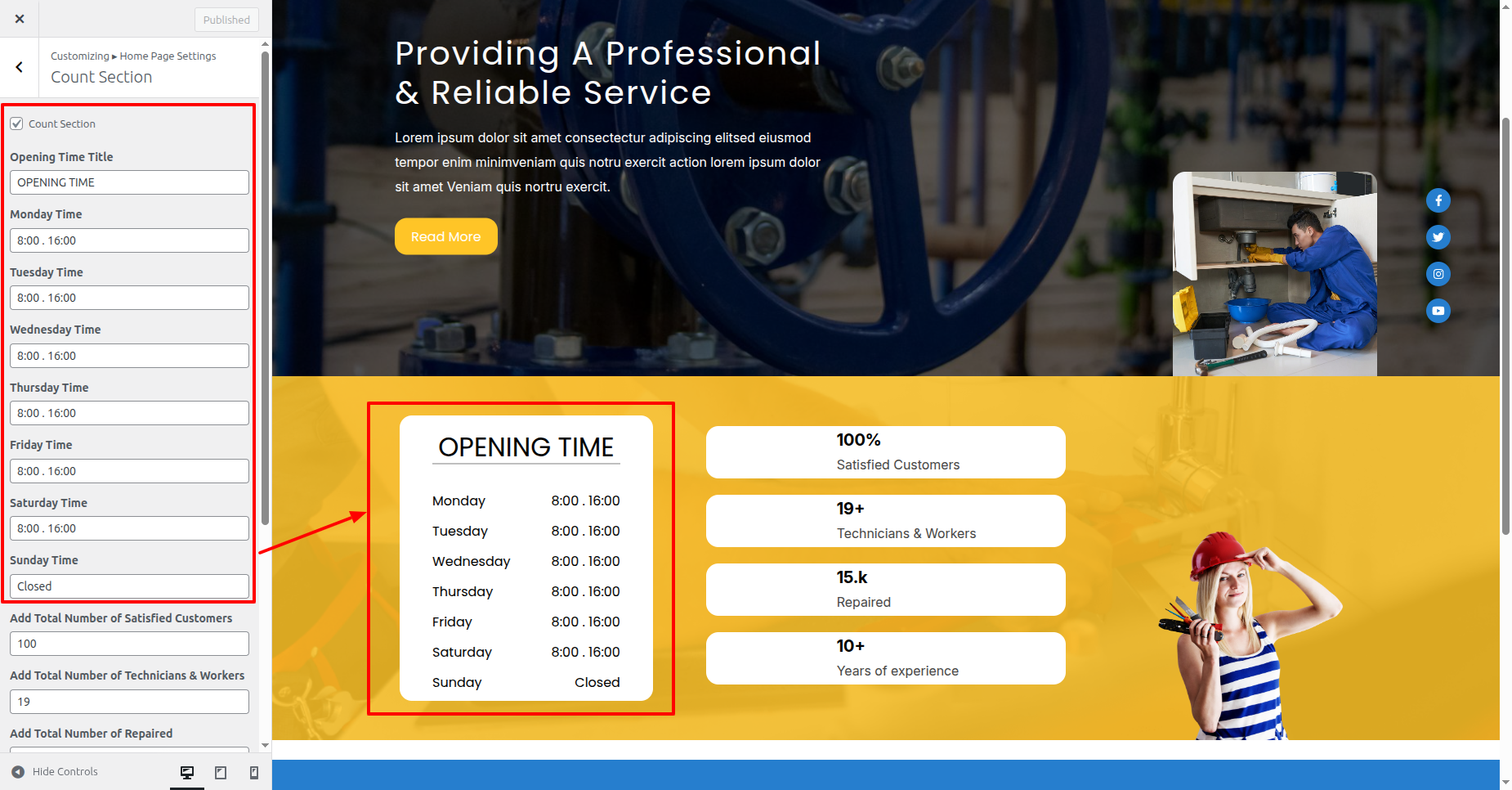 Select Count Section Settings from Appearance >> Customize >> Home Page Settings >> Count Section .
