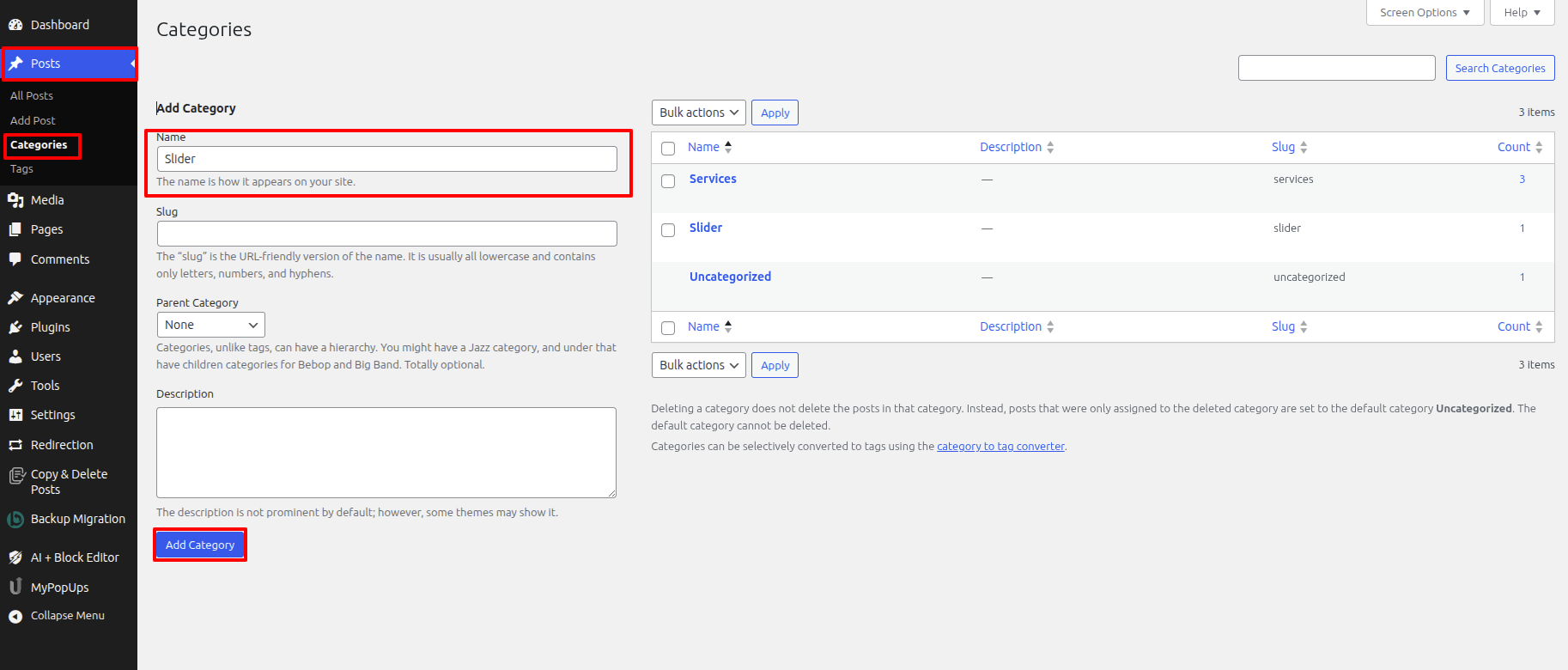 Select Slider Section Settings from Dashboard >> Posts >> Categories .