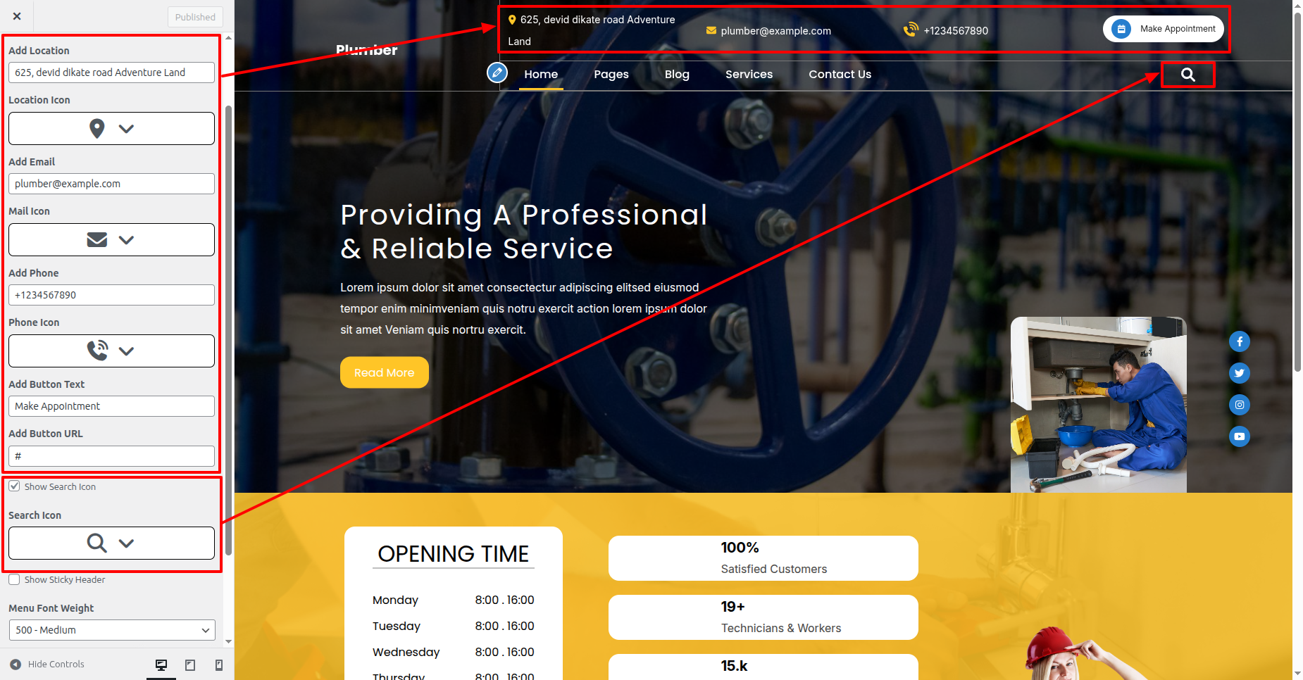 Select Header Top Section from Appearance >> Customize >> Home Page Settings >> Header Section Settings .