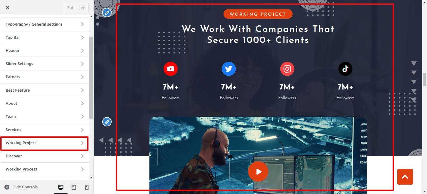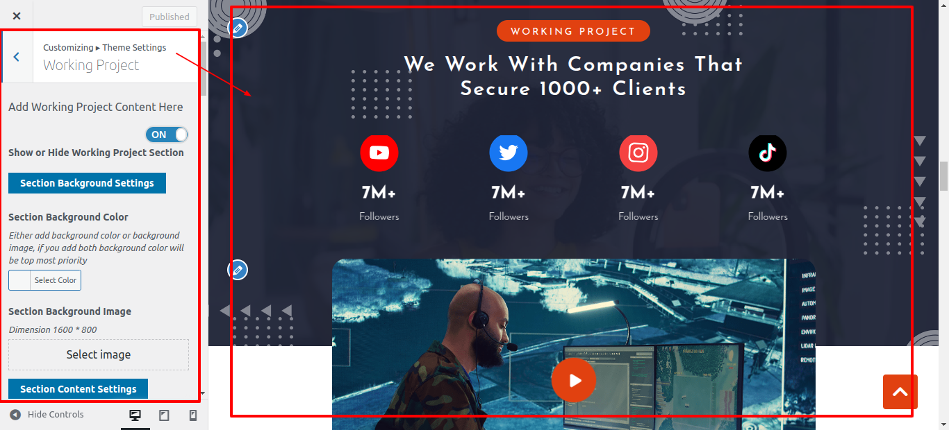 Go to Appearance >> Customize >> Theme Settings >> Working Project to access the Working Project settings.