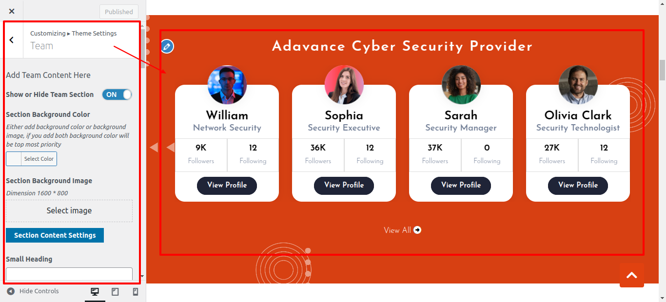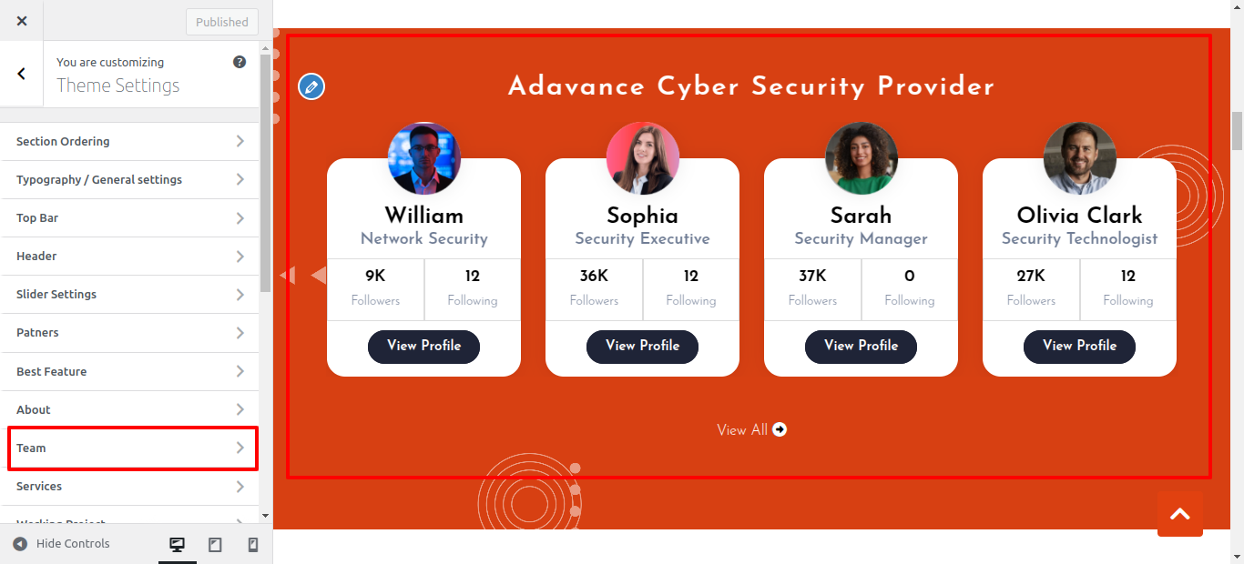 Go to Appearance >> Customize >> Theme Settings >> Team to access the Team settings.