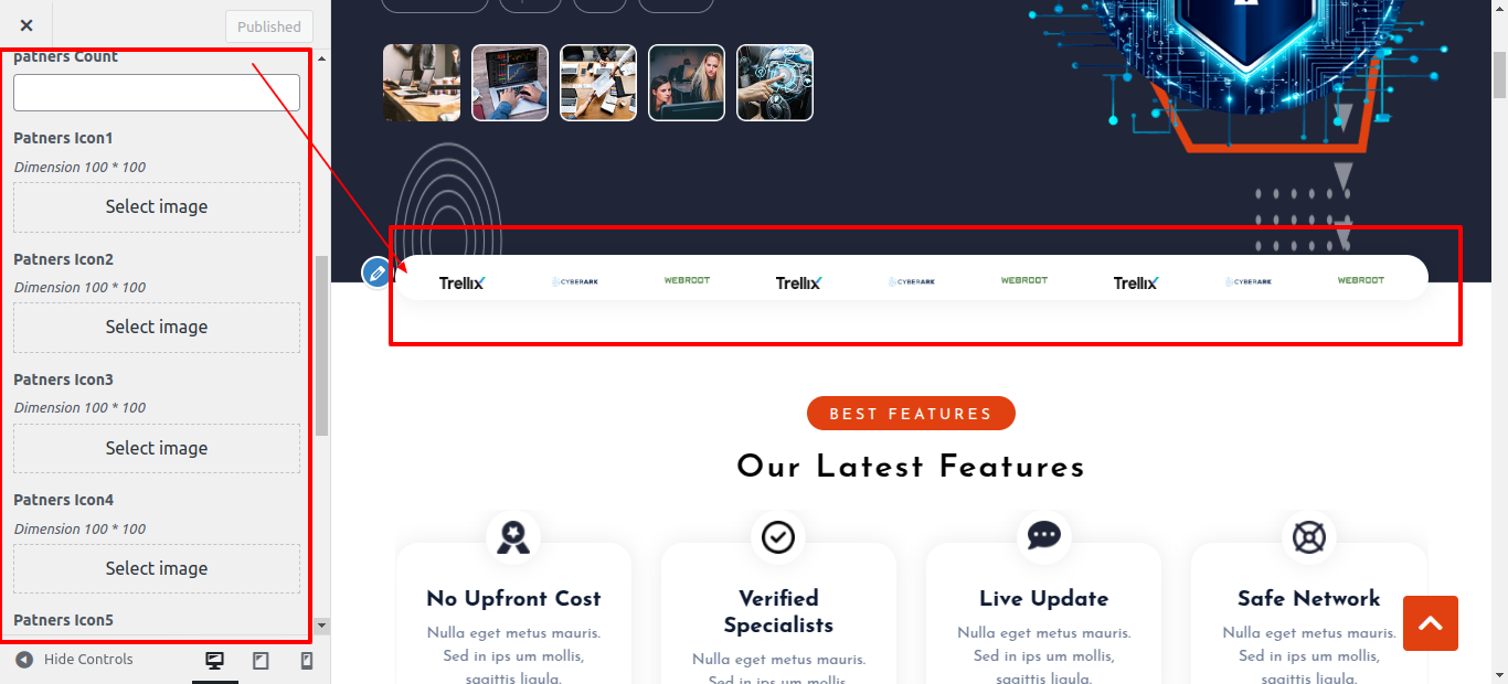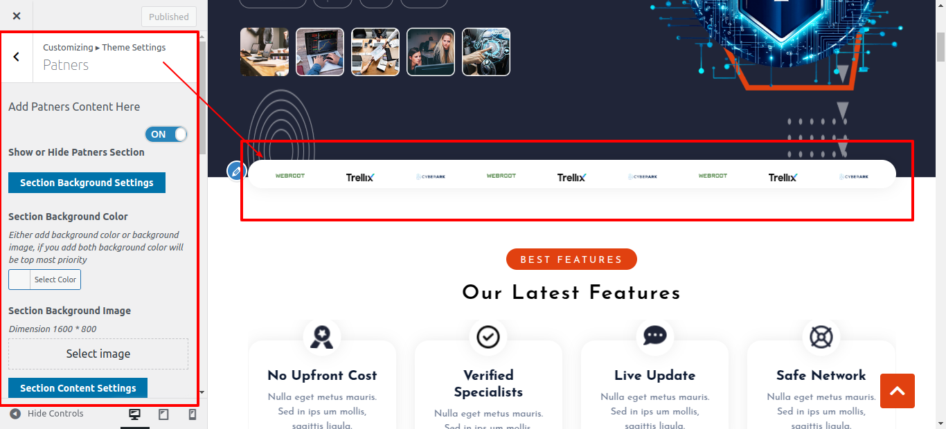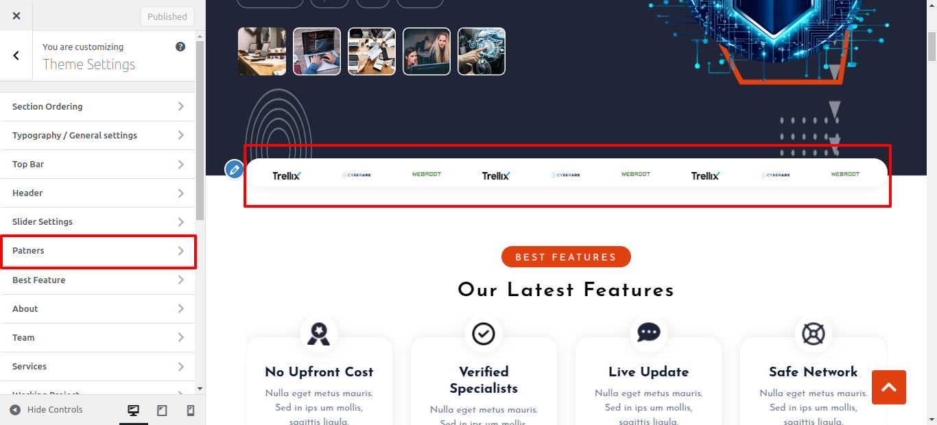 Go to Appearance >> Customize >> Theme Settings >> Patners Section to access the Patners Section settings.