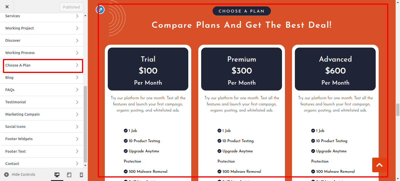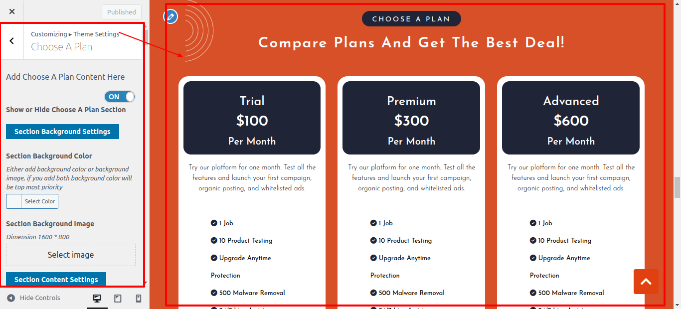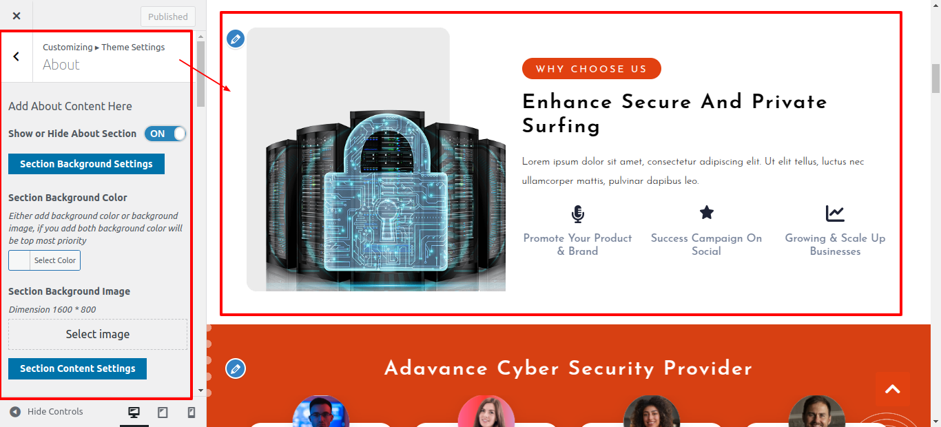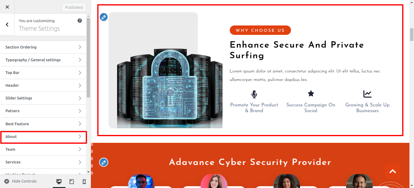 Go to Appearance >> Customize >> Theme Settings >> Services Section to access the Services Section settings.