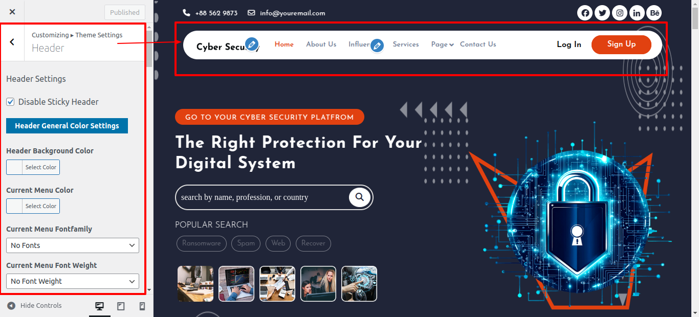 Go to Appearance >> Customize >> Theme Settings >> Header to access the Header Section Settings.