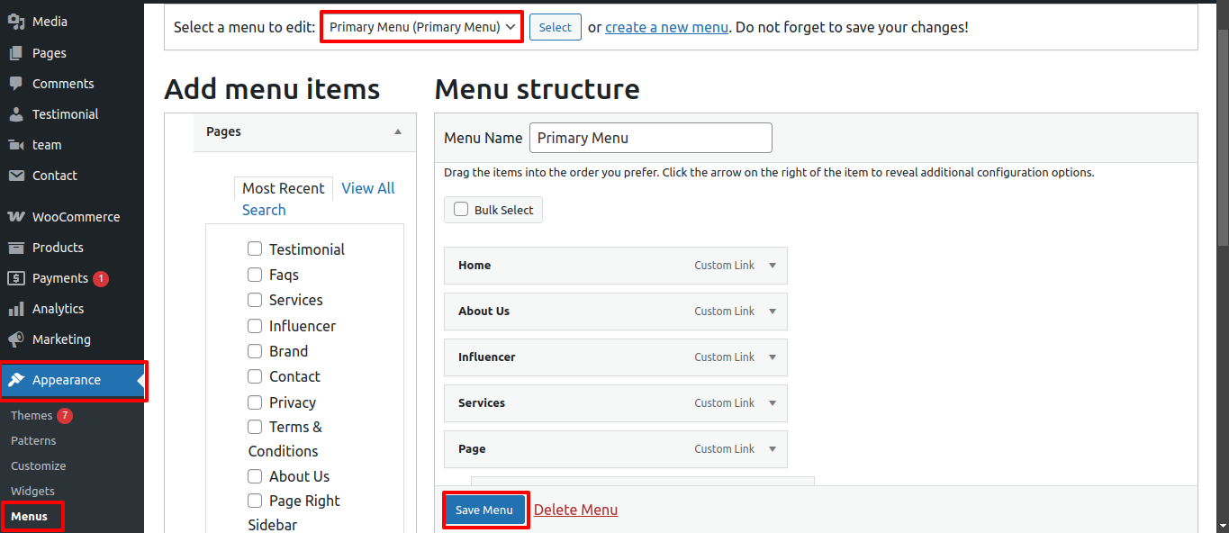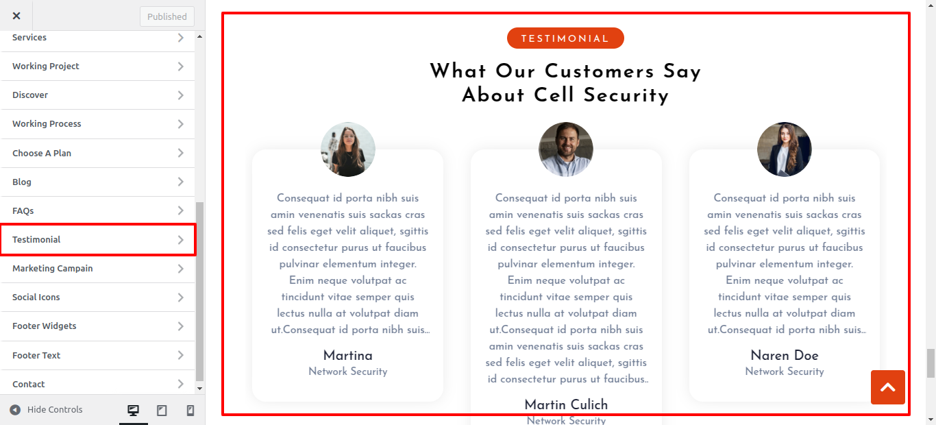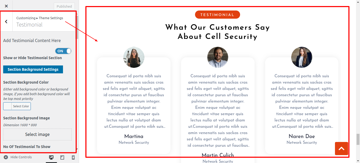 Go to Appearance >> Customize >> Theme Settings >> Testimonial Section to access the Testimonial Section settings.