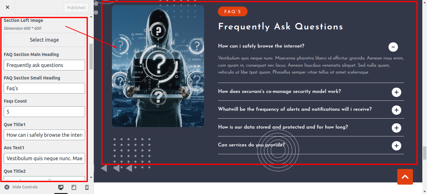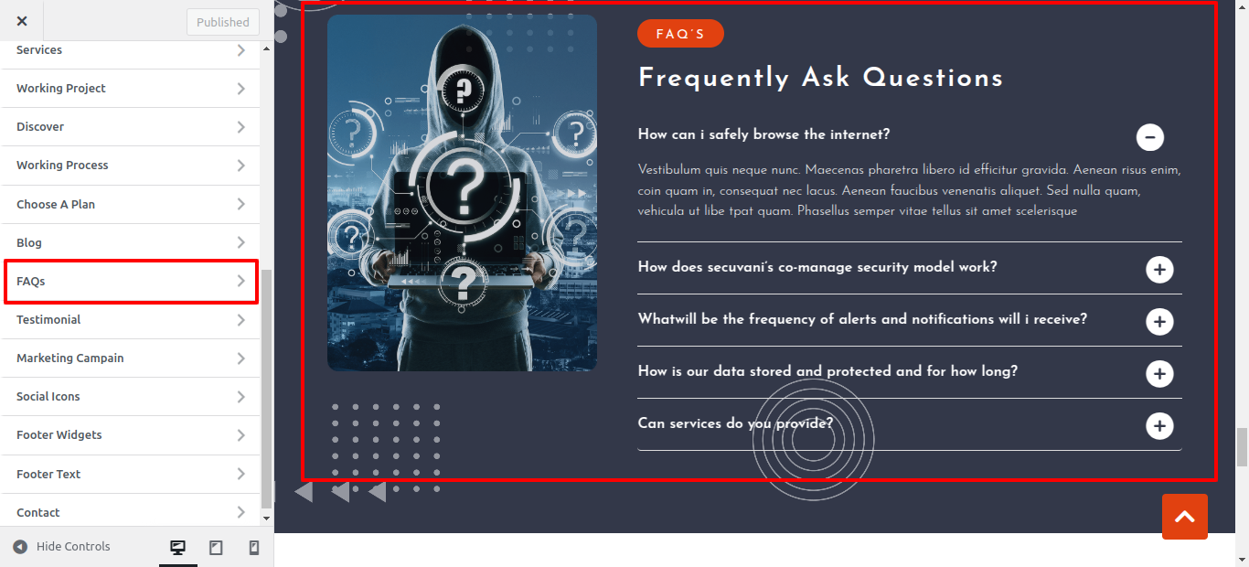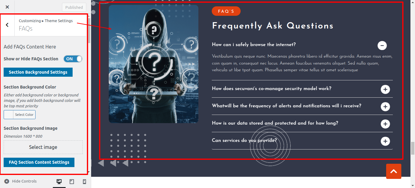 Go to Appearance >> Customize >> Theme Settings >> FAQS to access the FAQS settings.