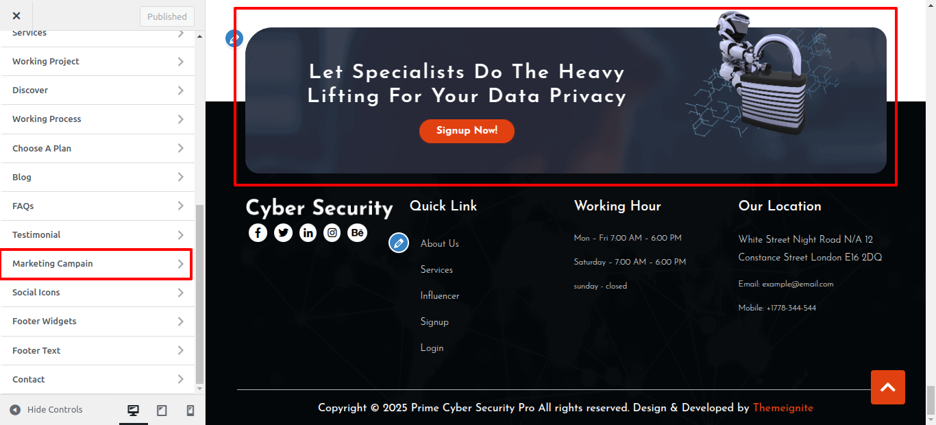Go to Appearance >> Customize >> Theme Settings >> Marketing Campain to access the Marketing Campain settings.
