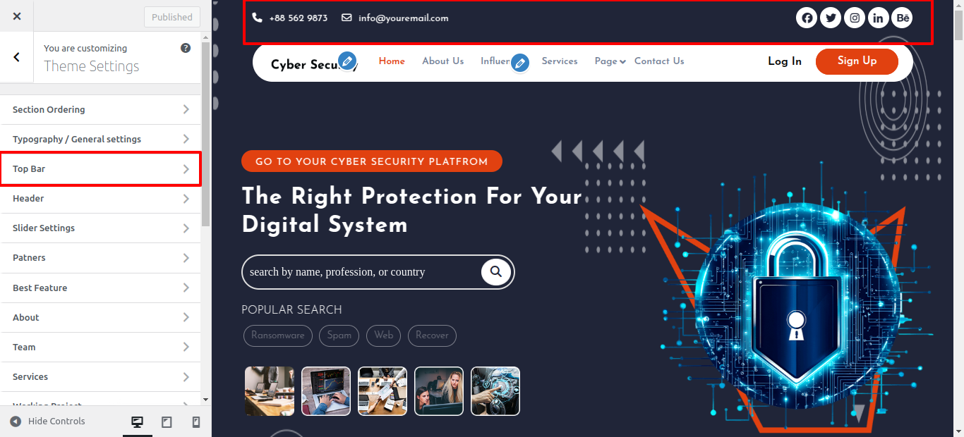 Go to Appearance >> Customize >> Theme Settings >> Top Bar to access the Topbar Section Settings.