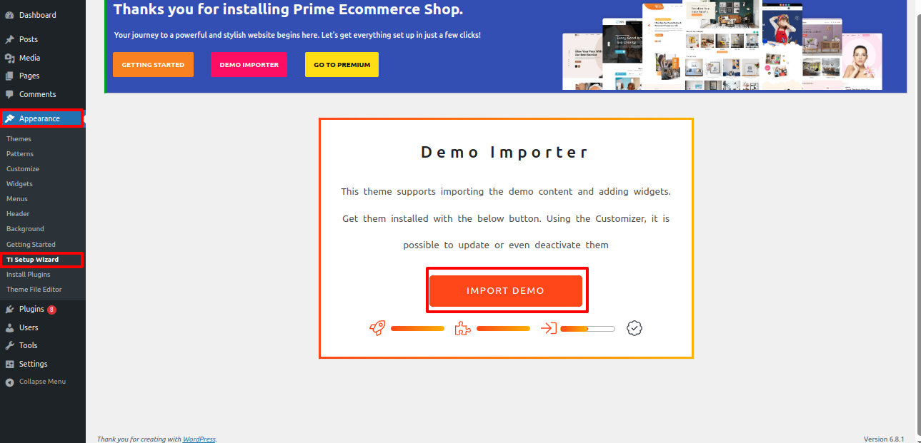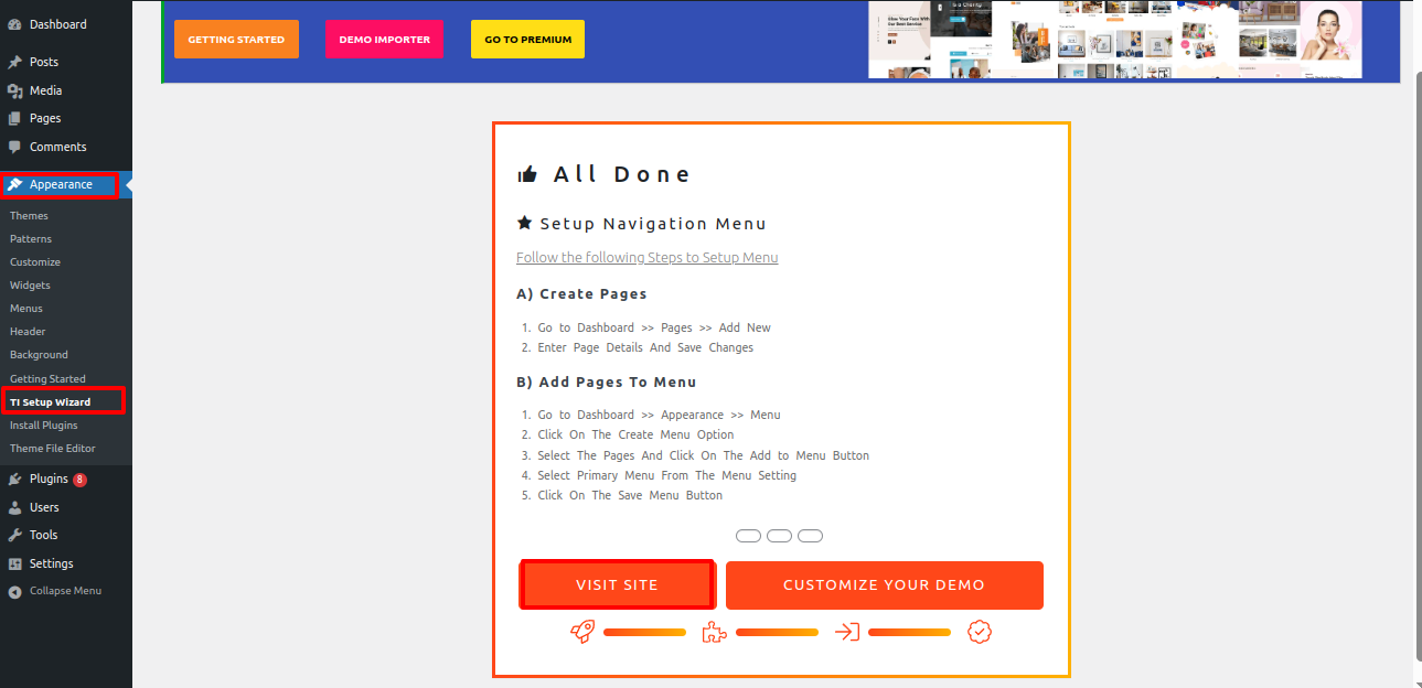 Select TI Setup Wizard from Dashboard >> Appearance >> TI Setup Wizard >> Start Now .