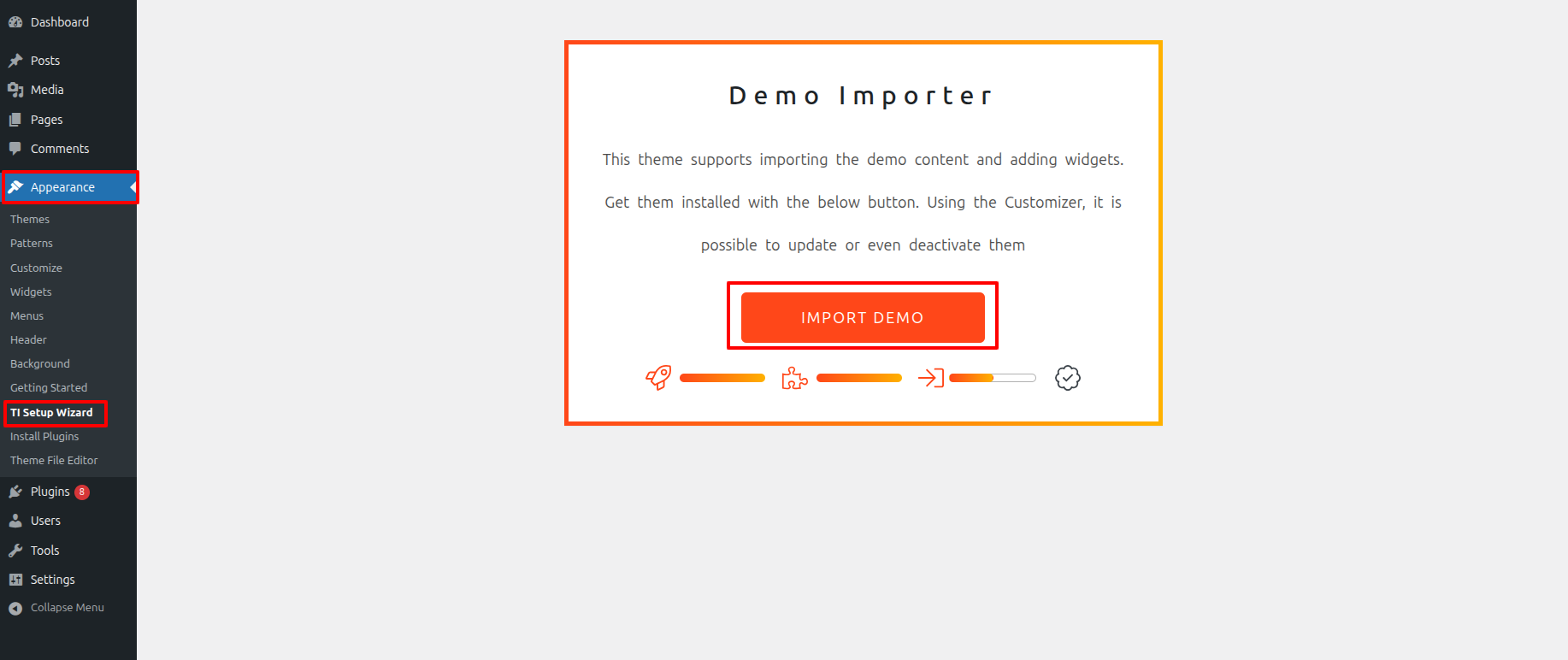 Select TI Setup Wizard from Dashboard >> Appearance >> TI Setup Wizard >> Start Now .