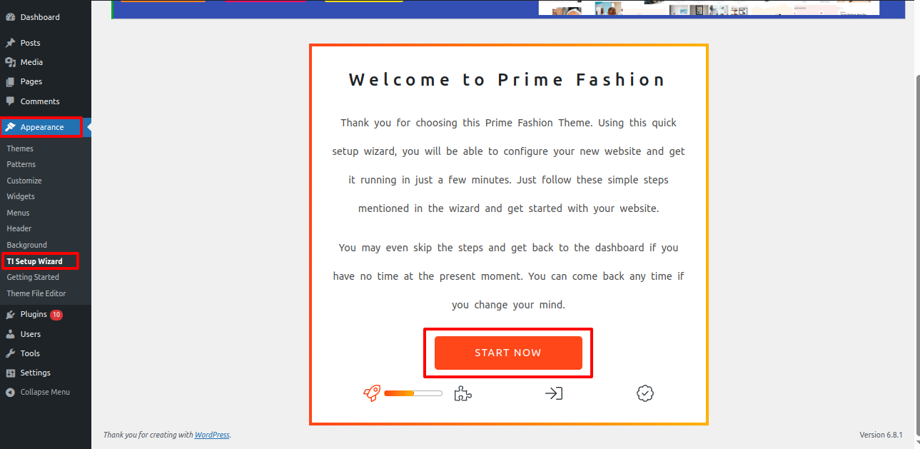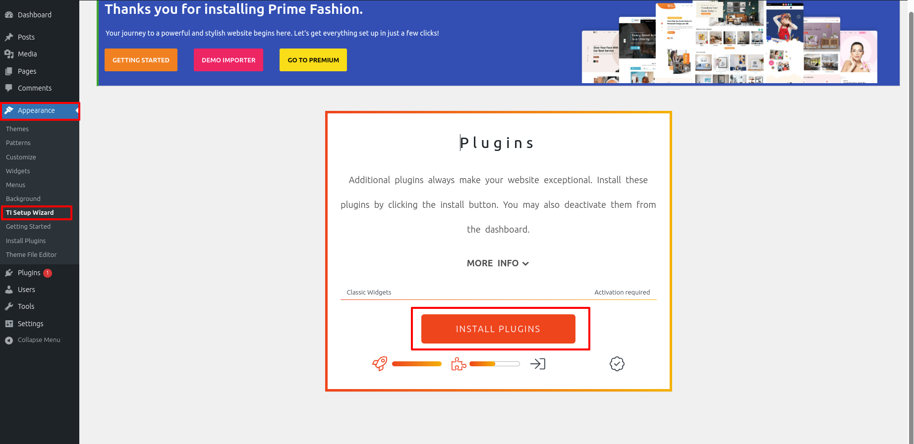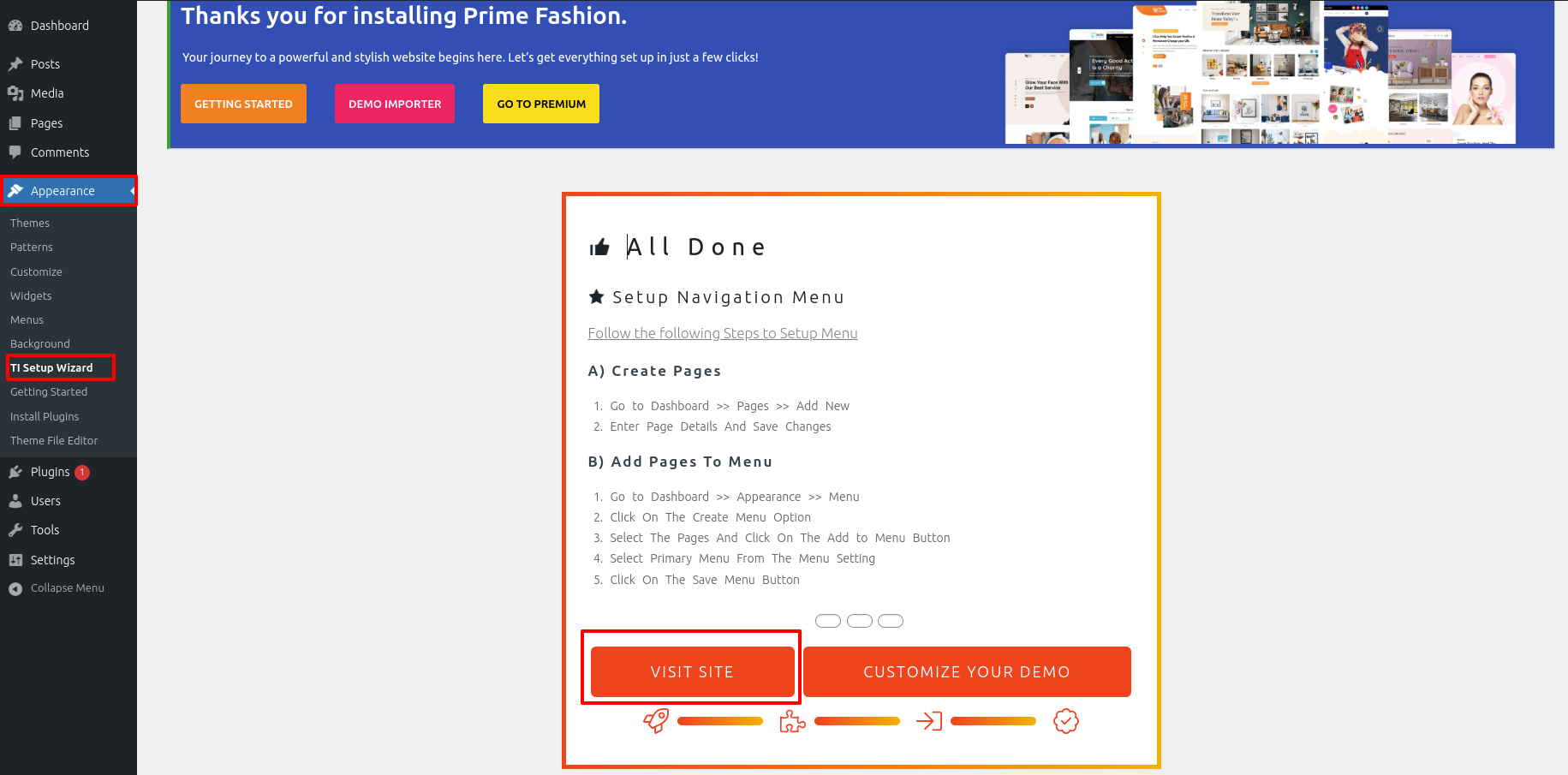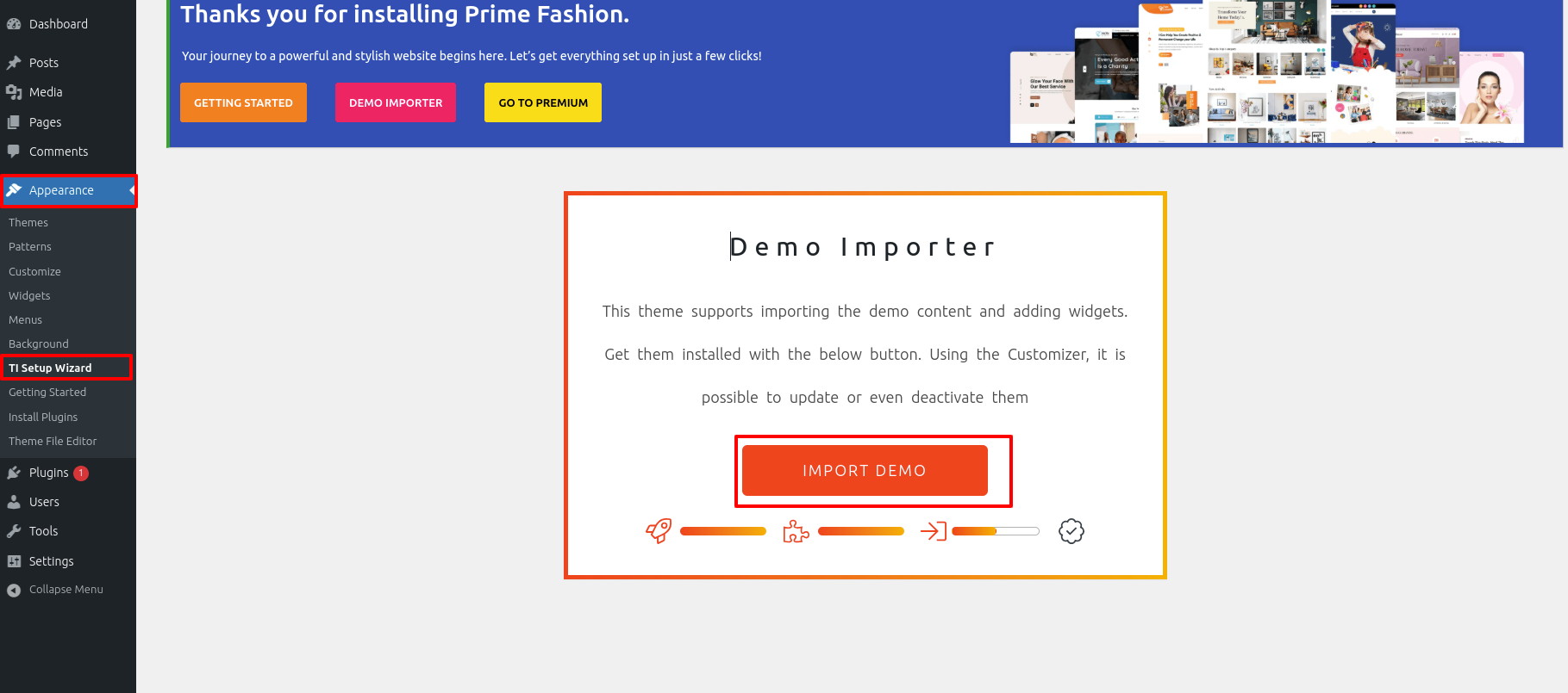 Select TI Setup Wizard from Dashboard >> Appearance >> TI Setup Wizard >> Start Now .