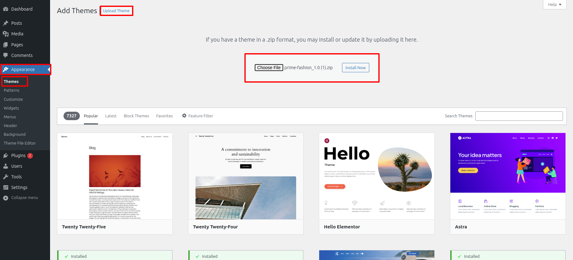 Select your prime-fashion.zip theme by clicking the Browse button, and then hit the Install Now button.