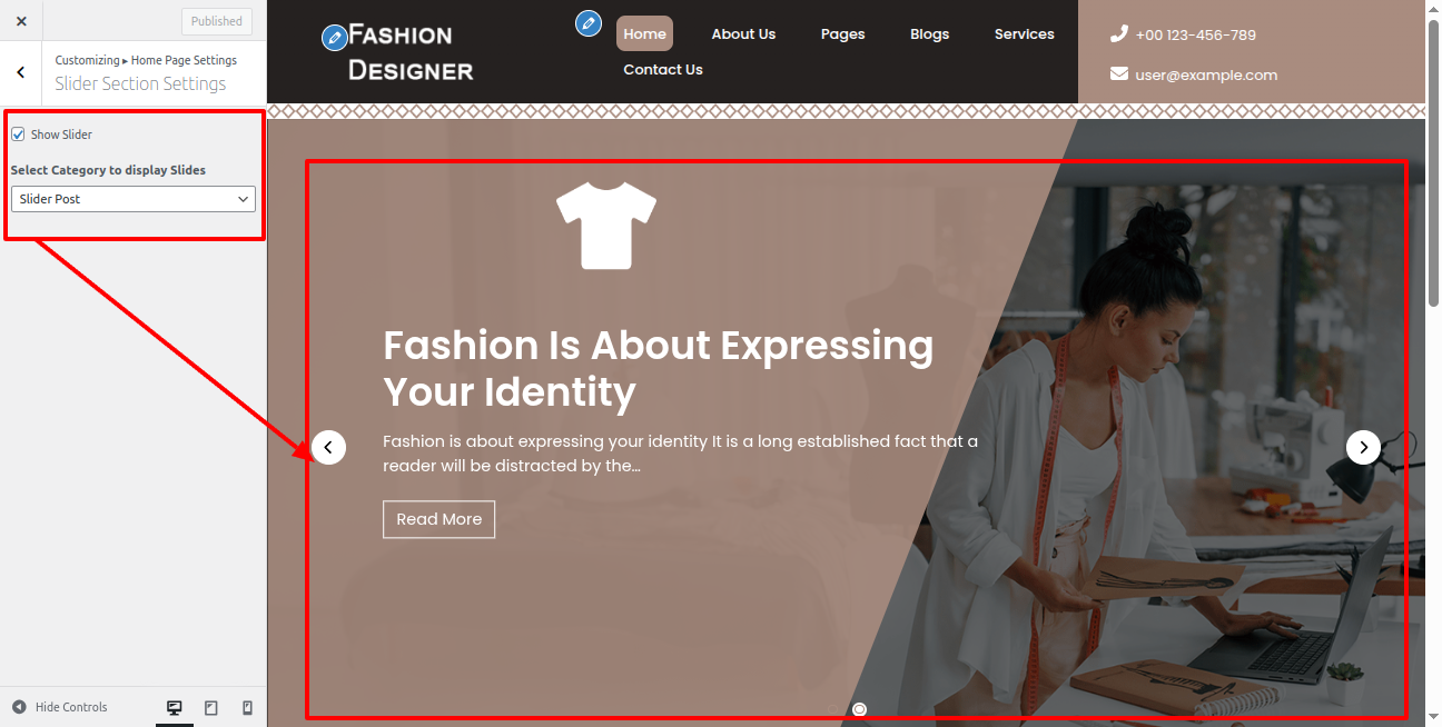 Select Slider Section Settings from Appearance >> Customize >> Home Page Settings >> Slider Section Settings .