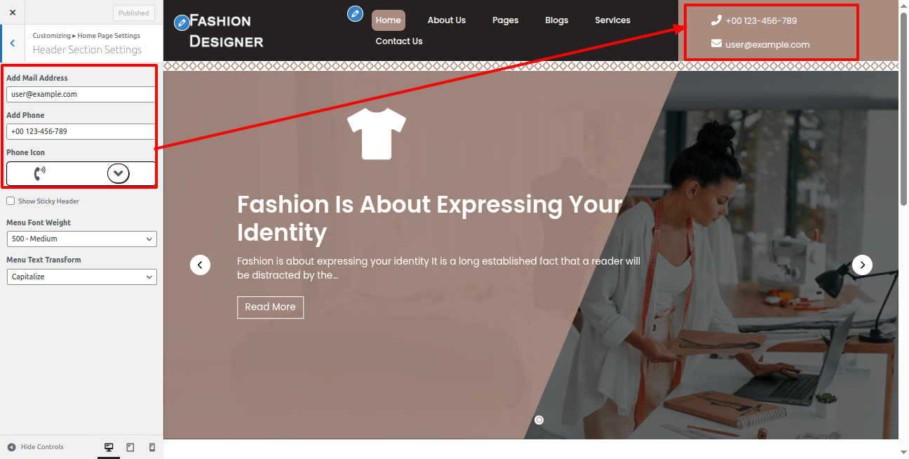 Select Header Top Section from Appearance >> Customize >> Home Page Settings >> Header Section Settings .