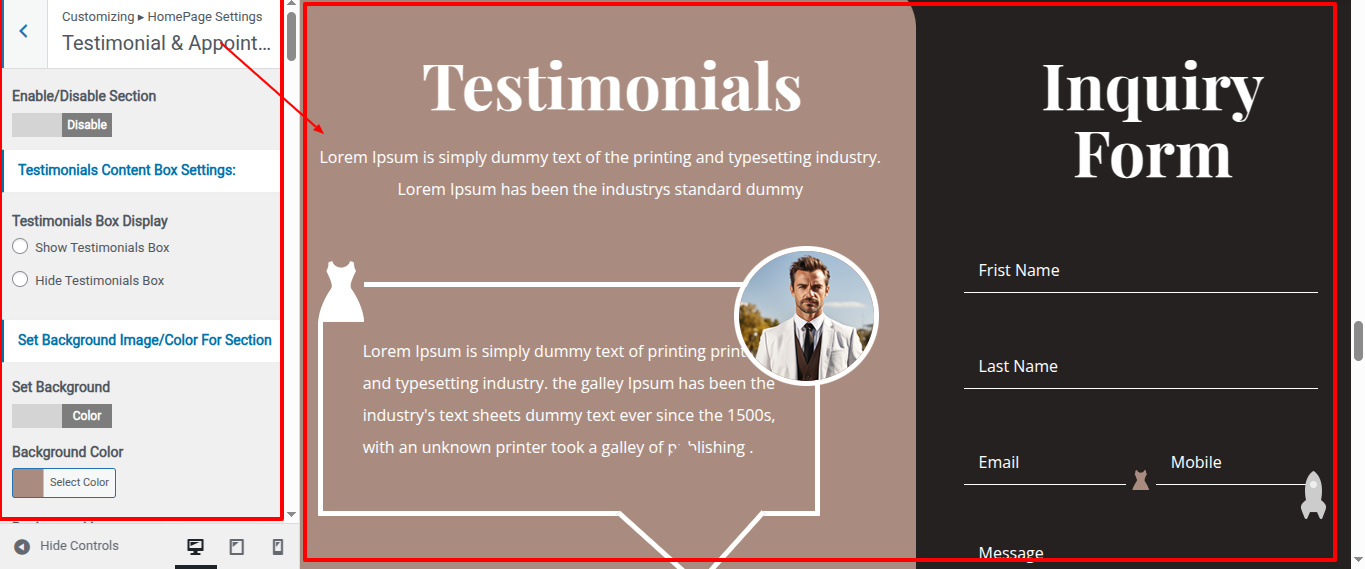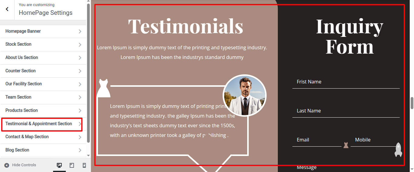 Go to Appearance >> Customize >> Home Page Sections >> Testimonial & Appointment to access the Testimonial & Appointment settings.