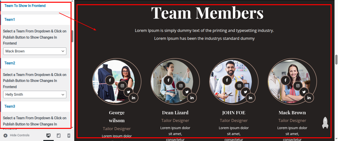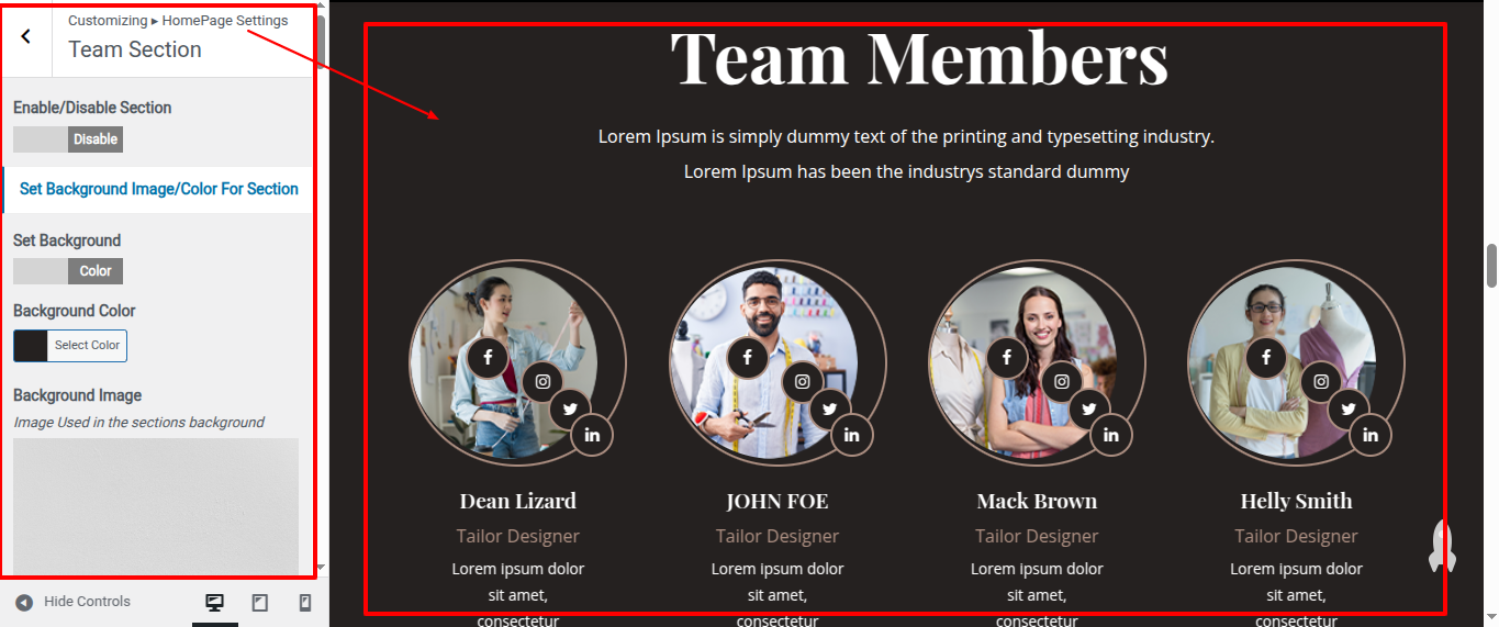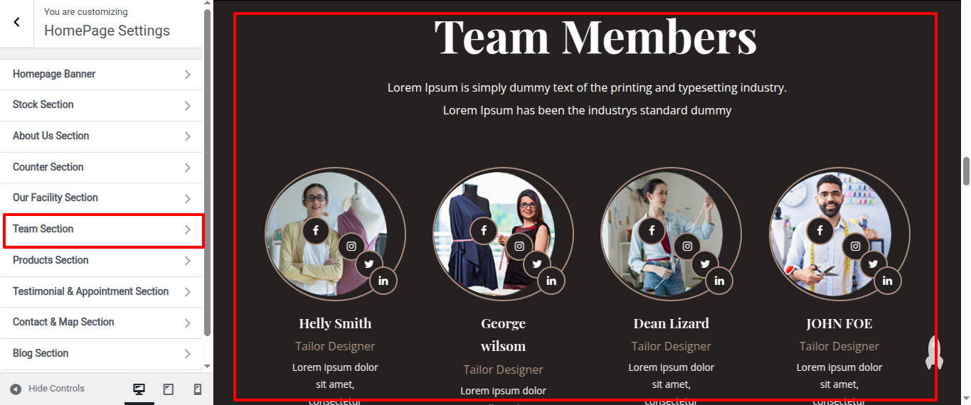 Go to Appearance >> Customize >> Home Page Sections >> Team to access the Team settings.