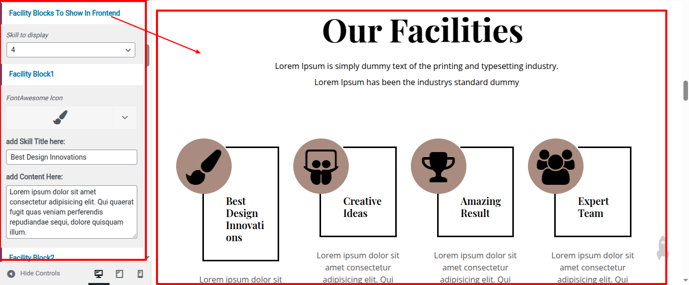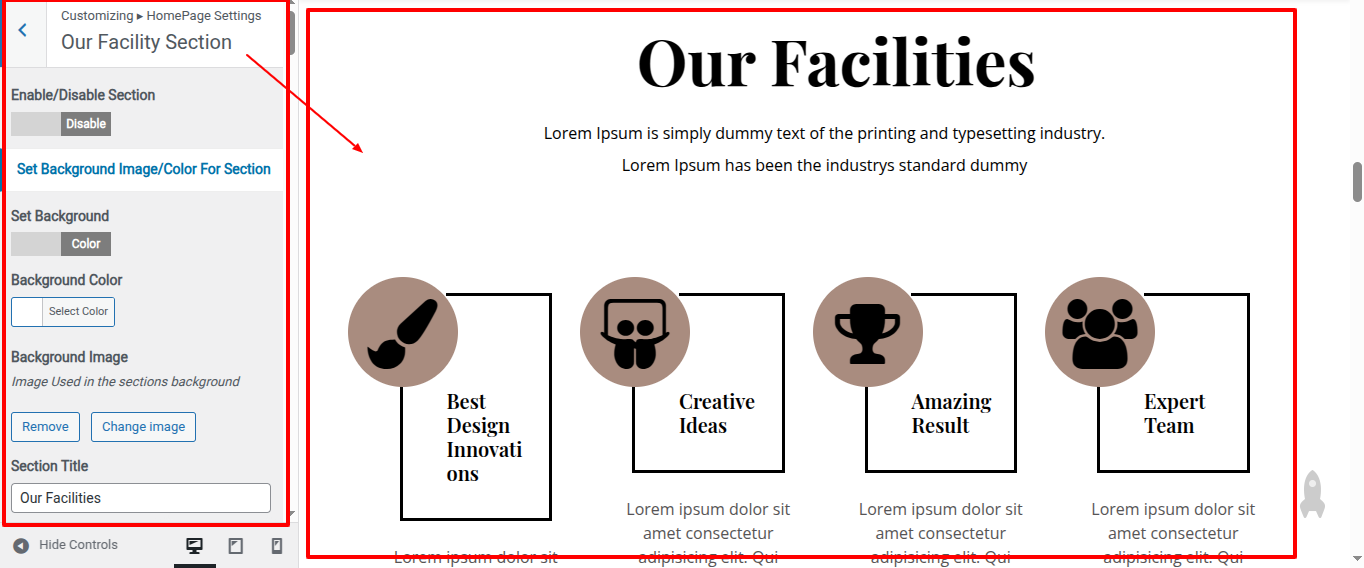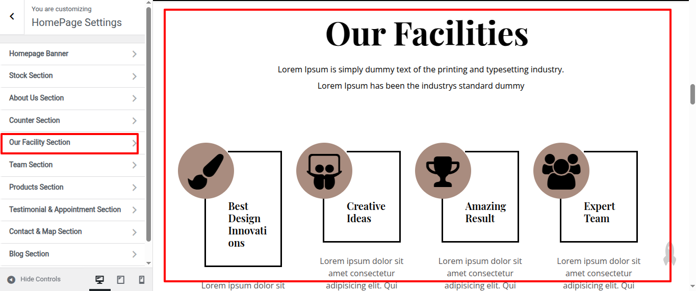 Go to Appearance >> Customize >> Home Page Sections >> Our Facility to access the Our Facility settings.