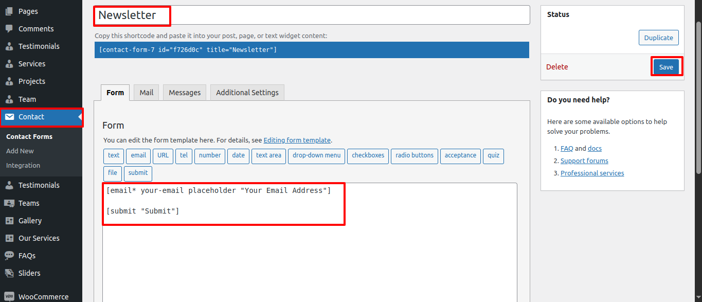 In this section the contact form is been created named as "Newsletter" for any changes of content you'll have to do following steps: