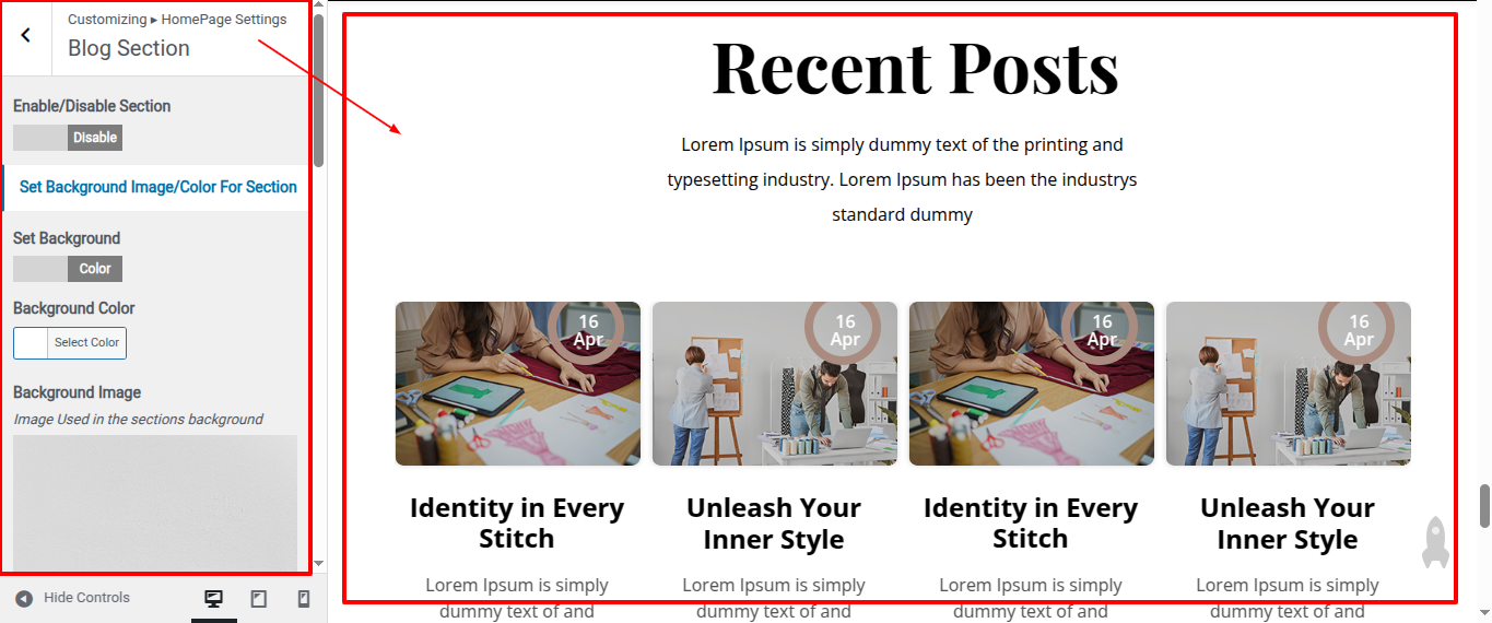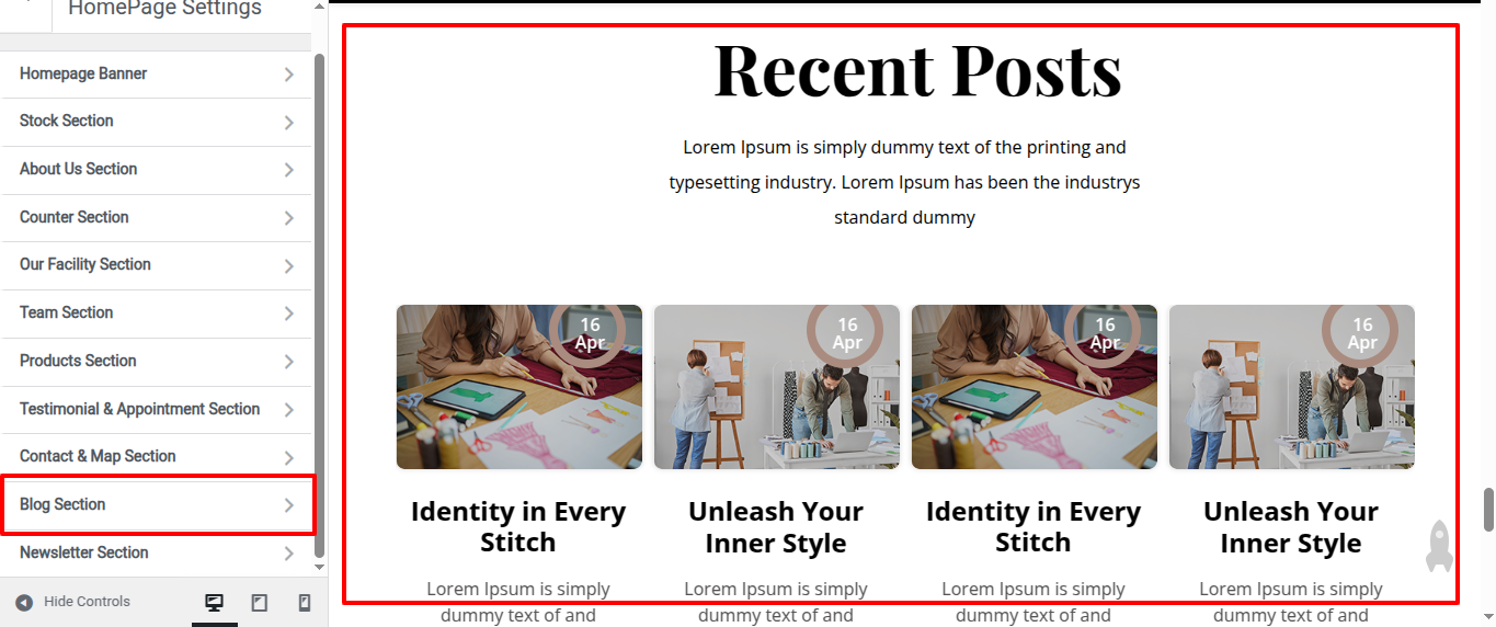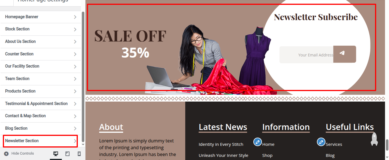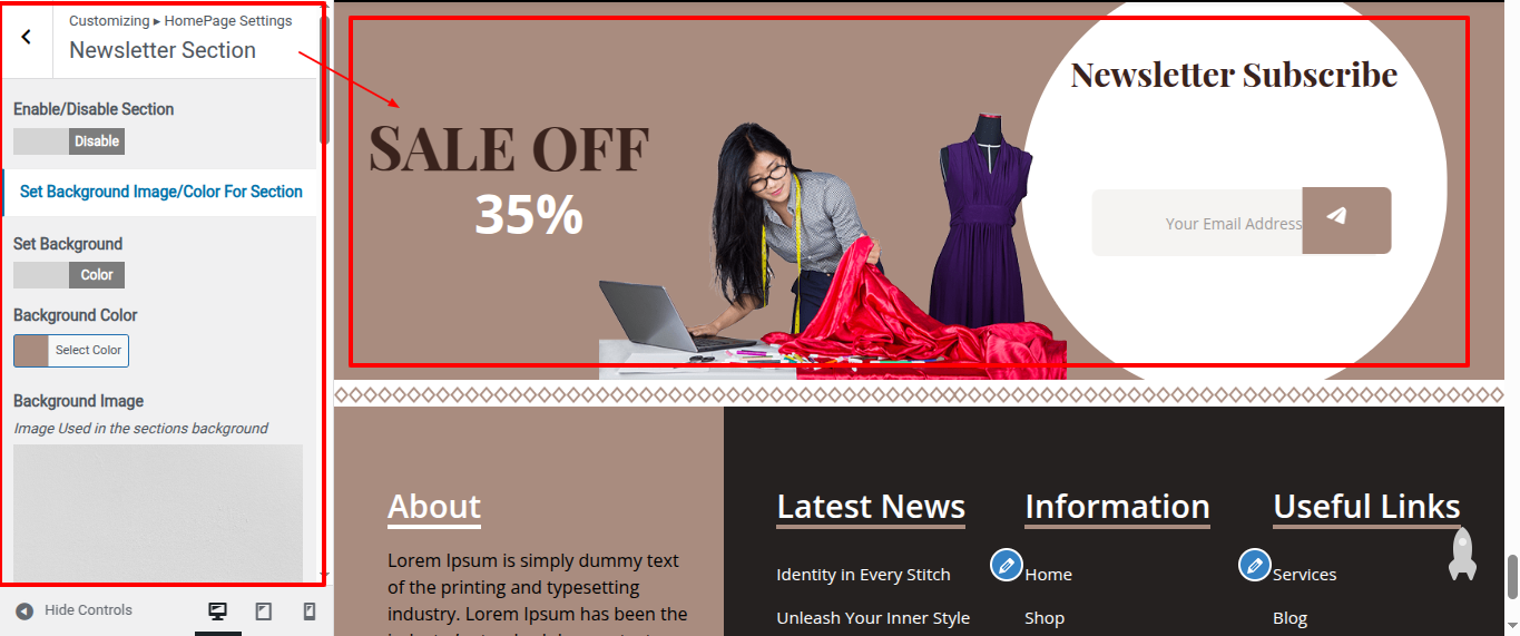 Go to Appearance >> Customize >> Home Page Sections >> Newsletter Section to access the Newsletter Section settings.