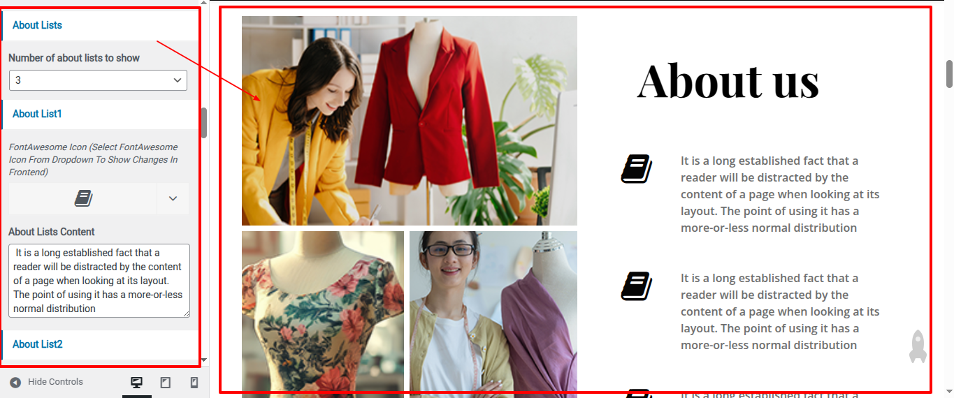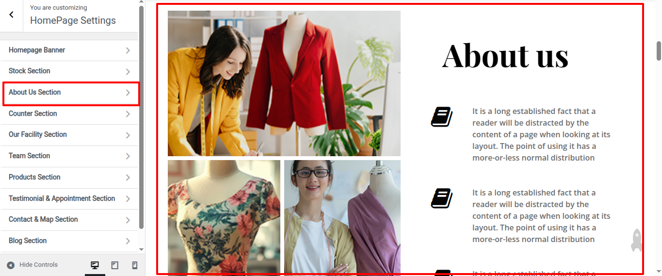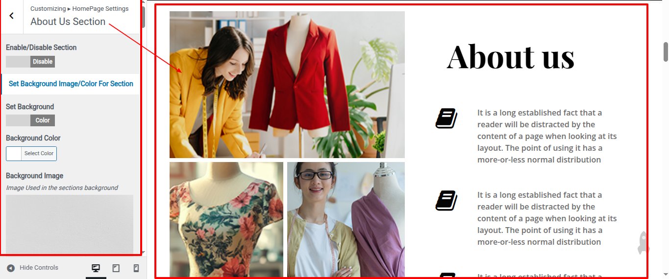 Go to Appearance >> Customize >> Home Page Sections >> About Us Section to access the About Us Section settings.