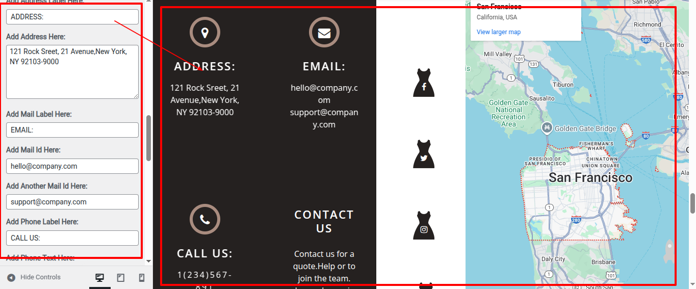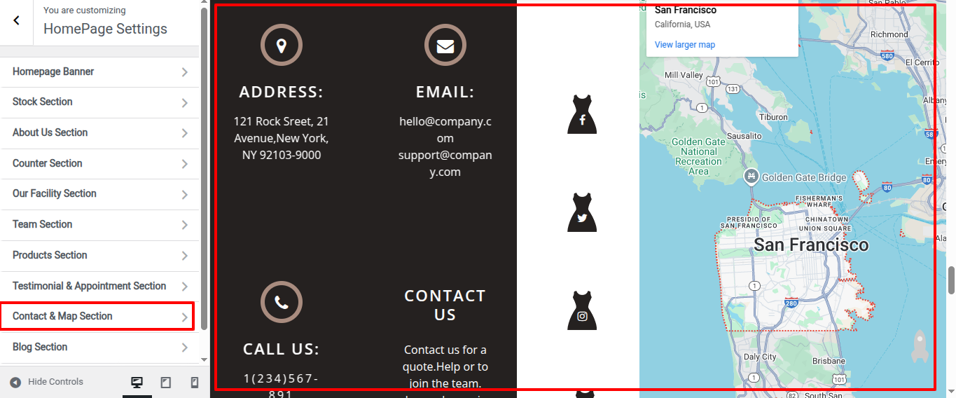 The following sections are included in the Contact & Map Section customization: