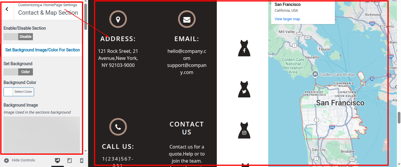 SELECT Customize >> Home Page Sections >> Contact & Map Section under Appearance.