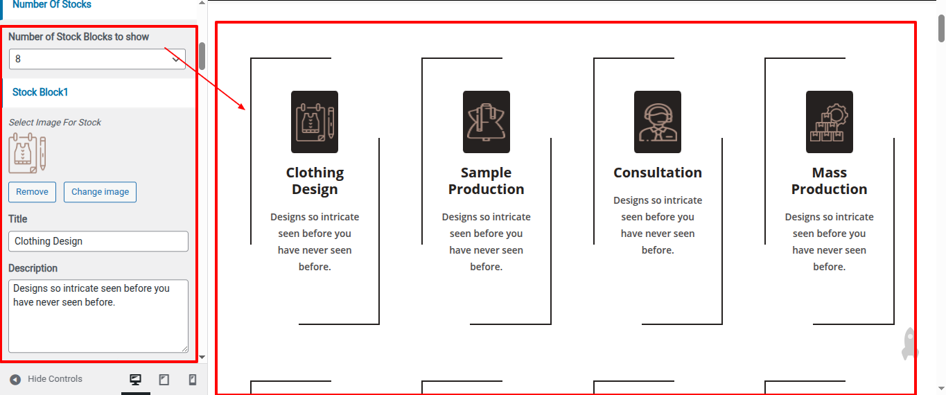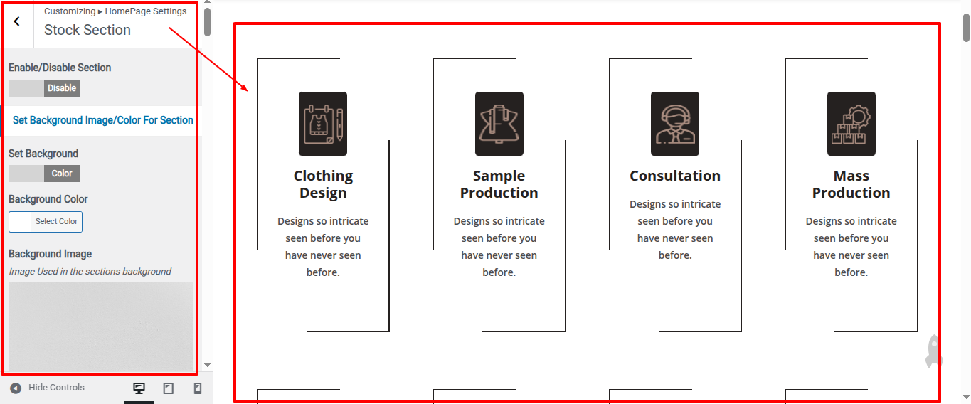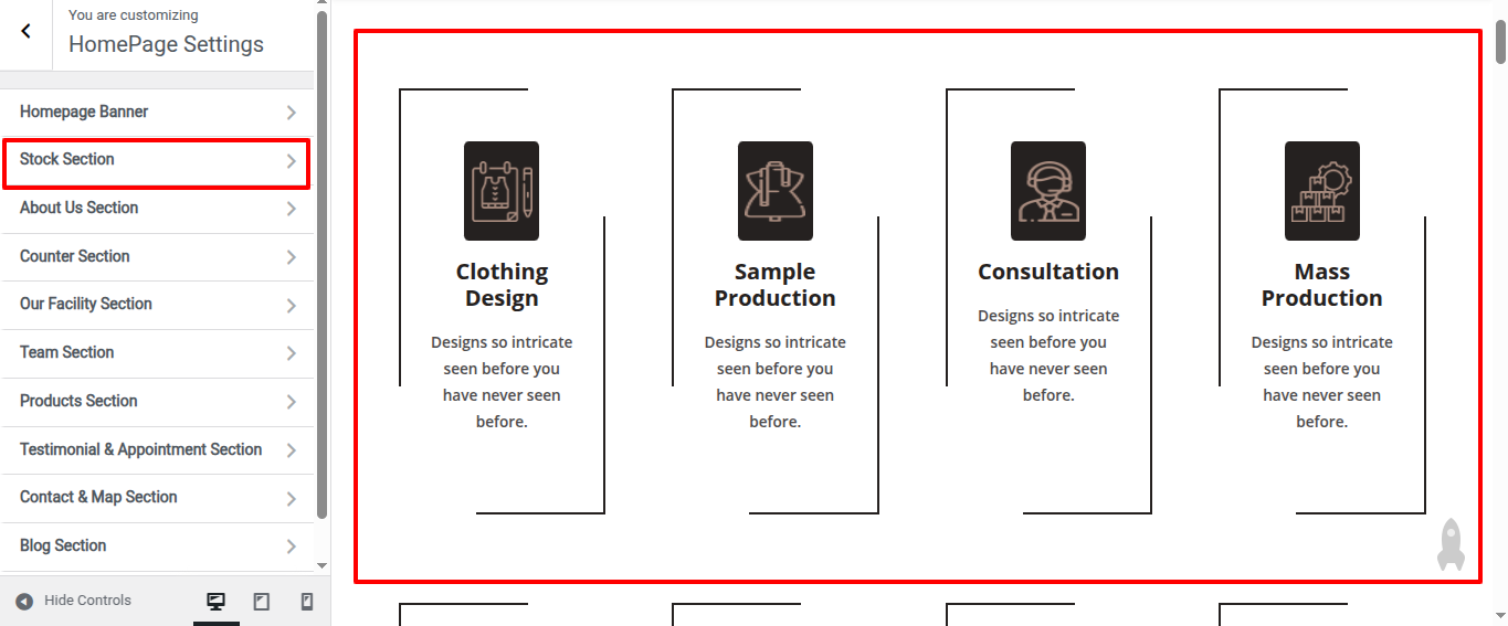 Go to Appearance >> Customize >> Home Page Sections >> Stock to access the Stock settings.