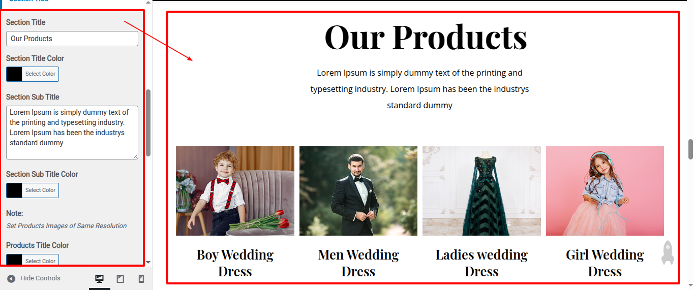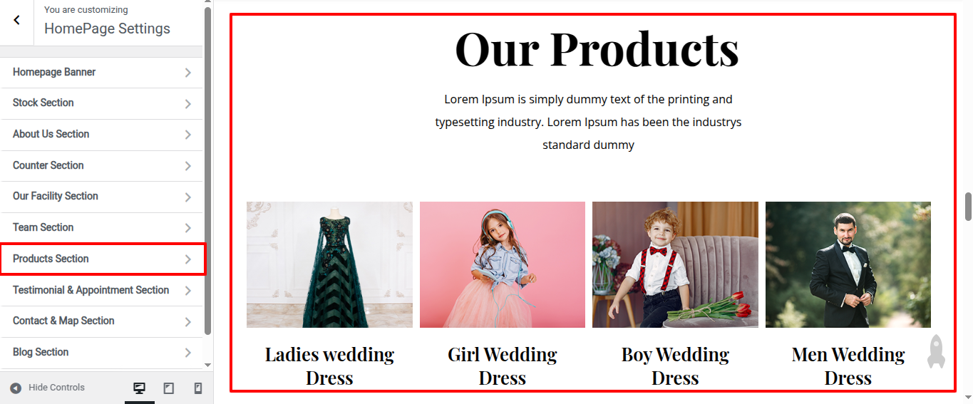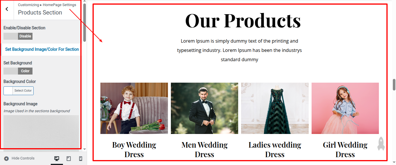 Go to Appearance >> Customize >> Home Page Sections >> Products to access the Products settings.