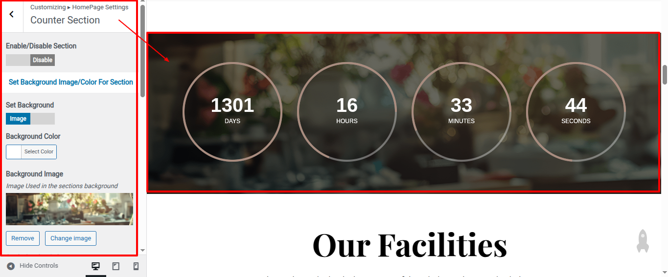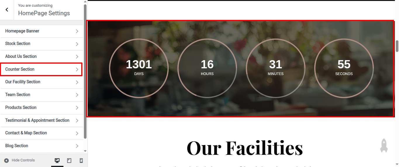 Go to Appearance >> Customize >> Home Page Sections >> Counter to access the Counter settings.