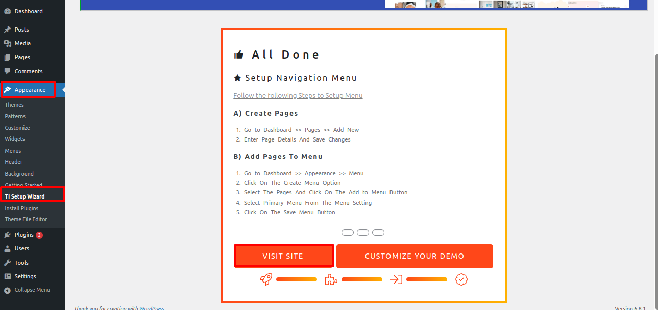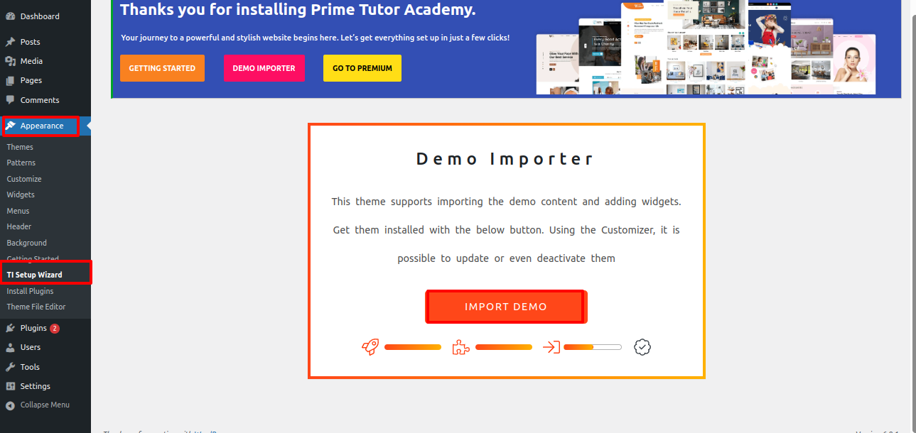 Select TI Setup Wizard from Dashboard >> Appearance >> TI Setup Wizard >> Start Now .