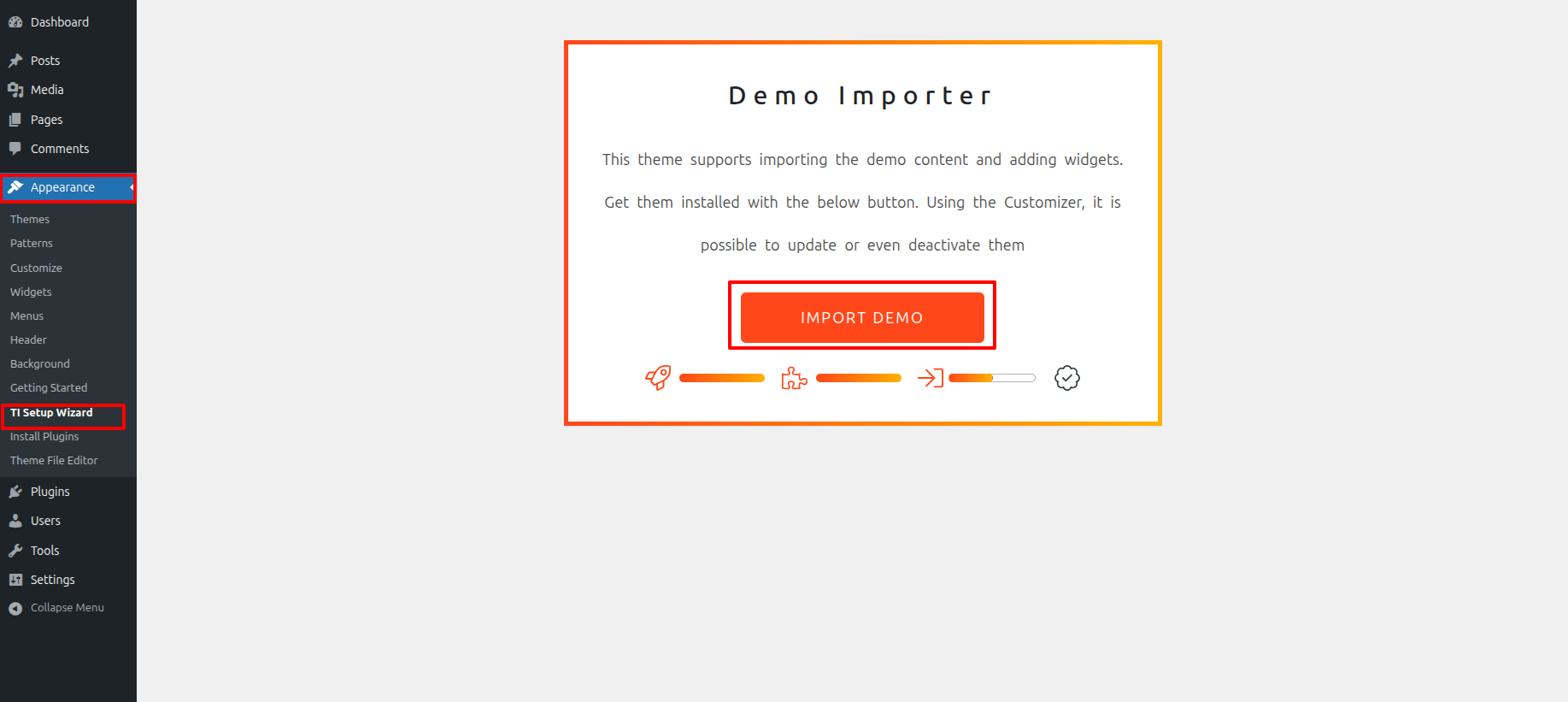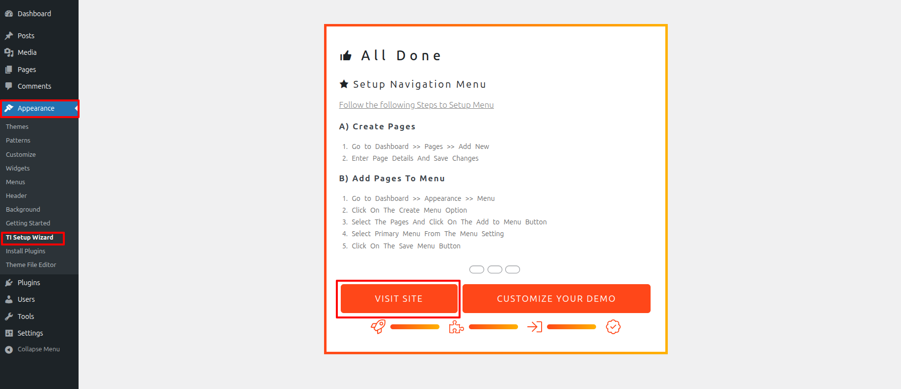 Select TI Setup Wizard from Dashboard >> Appearance >> TI Setup Wizard >> Start Now .